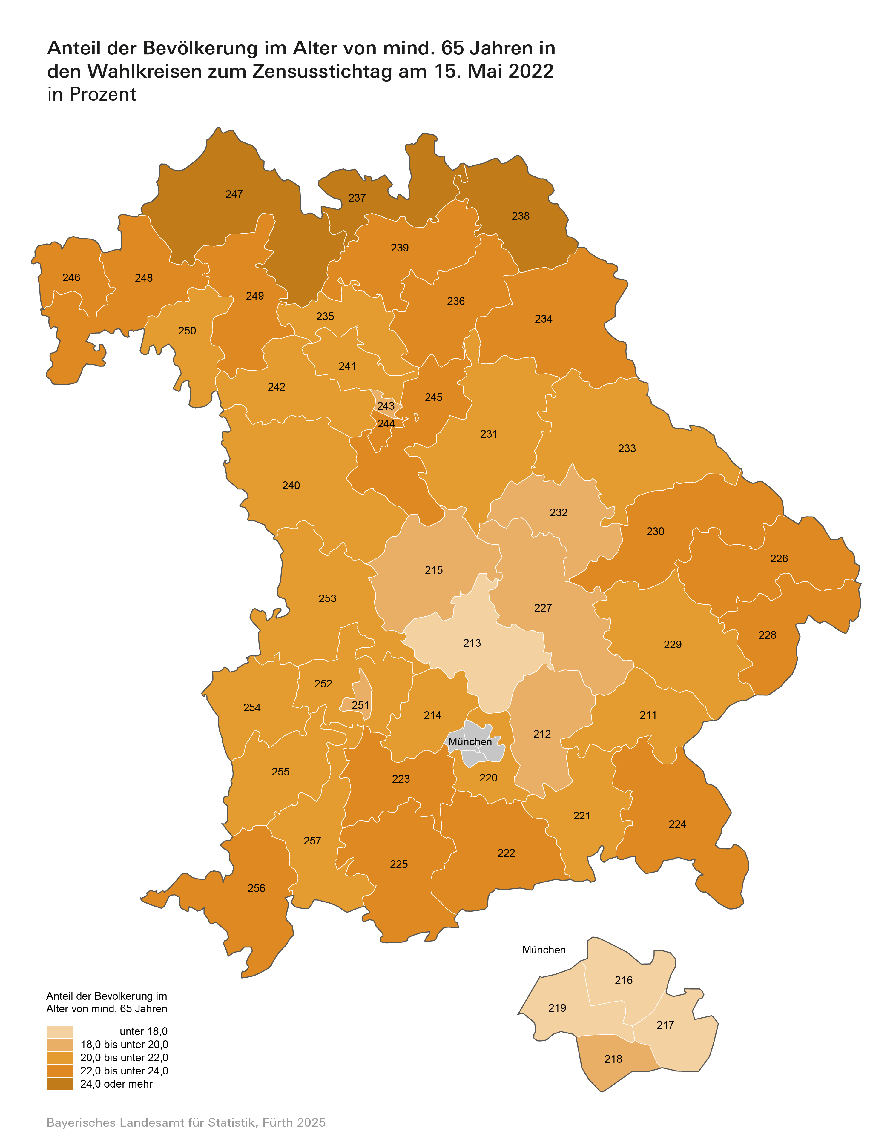 „Memmingen-Unterallgäu“. Dort leben zum Stichtag des Zensus am 15. Mai 2022 rund 212 000 Personen, wovon 17,6 Prozent Kinder und Jugendliche und 21,6 Prozent 65 Jahre oder älter sind. Ein Großteil der Einwohner ist verheiratet (45,9 Prozent), und mehr als jede zweite Person ist Mitglied der römisch-katholischen Kirche (53,3 Prozent). Innerhalb der Bevölkerung mit deutscher Staatsbürgerschaft sind die Jahrgänge, die bei dieser Bundestagswahl zum ersten Mal von ihrem Wahlrecht Gebrauch nehmen dürfen, mit 3,9 Prozent vertreten. Das sind Personen mit deutscher Staatsbürgerschaft, die zum Zensus-Stichtag 15 bis 18 Jahre alt waren.2