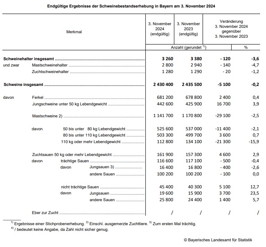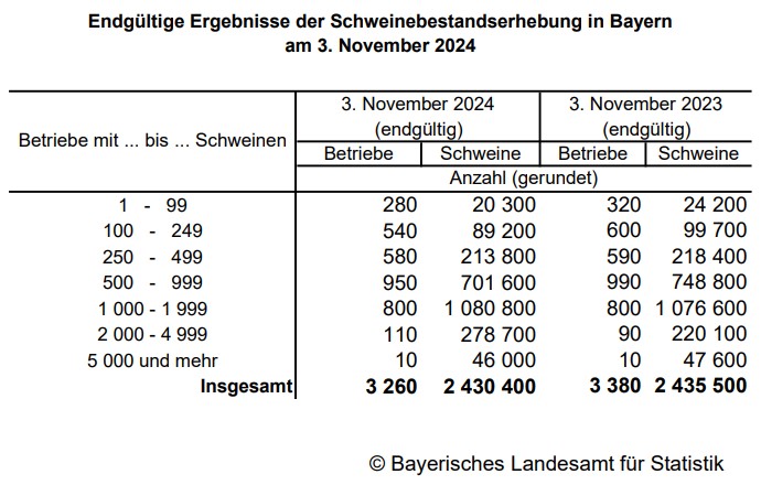 Fürth. Wie das Bayerische Landesamt für Statistik nach den endgültigen Ergebnissen der Schweinebestandserhebung zum Stichtag 3. November 2024 mitteilt, ist die Zahl der Schweine gegenüber dem Vorjahr um 0,2 Prozent (-5 100 Tiere) auf 2 430 400 Tiere gesunken. Die Anzahl der schweinehaltenden Betriebe liegt bei rund 3 260, das sind 3,6 Prozent weniger als ein Jahr zuvor: Zum 3. November 2023 waren noch rund 120 Betriebe mehr in Bayern aktiv. Im Durchschnitt hält jeder Betrieb 745 Tiere, etwa 25 mehr als im November 2023.