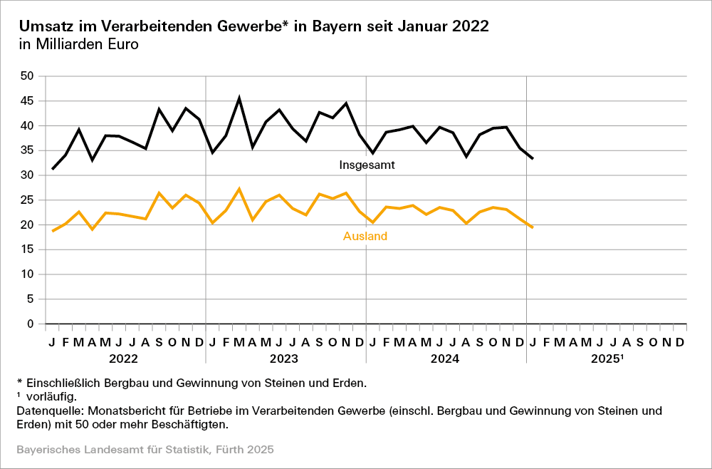 Fürth. Im Januar 2025 verzeichnet das Verarbeitende Gewerbe Bayerns einen Umsatzrückgang von nominal 3,4 Prozent gegenüber dem entsprechenden Vorjahreszeitraum. Das Verarbeitende Gewerbe, bezogen auf den Berichtskreis „Betriebe mit 50 oder mehr Beschäftigten“, umfasst hierbei auch immer den Bergbau und die Gewinnung von Steinen und Erden.