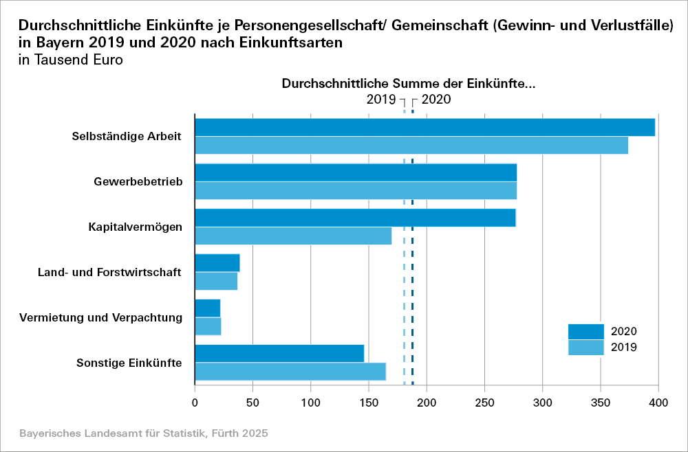71,1 Prozent (bzw. 31,16 Milliarden Euro) aller Einkünfte der Personengesellschaften und Gemeinschaften im Freistaat 2020 stammten aus gewerblicher Tätigkeit und 13,7 Prozent (bzw. 6,02 Milliarden Euro) aus selbstständiger Arbeit. Die restlichen Einkünfte resultieren aus Land- und Forstwirtschaft, Kapitalvermögen, Vermietung und Verpachtung sowie sonstigen Einkünften. Über alle Einkunftsarten hinweg lagen die durchschnittlichen Einkünfte je Personengesellschaft bzw. Gemeinschaft bei 184 068 Euro (2019: 178 627 Euro). Die höchsten durchschnittlichen Einkünfte je Personengesellschaft bzw. Gemeinschaft wurden mit 397 047 Euro aus selbständiger Arbeit erzielt (vgl. Grafik).