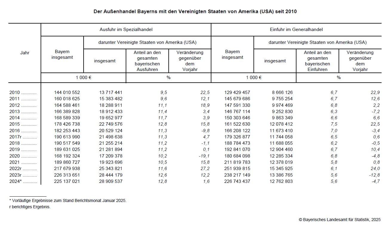 Laut einer Mitteilung des Bayerischen Landesamts für Statistik nach vorläufigen Ergebnissen der Außenhandelsstatistik exportiert die bayerische Wirtschaft im Jahr 2024 Waren im Wert 225,1 Milliarden Euro. Davon gehen rund 28,9 Milliarden Euro beziehungsweise 12,8 Prozent in die Vereinigten Staaten von Amerika (USA). Die USA sind damit auch im Jahr 2024 das führende Exportland Bayerns. Gegenüber 2023 nehmen die Exporte 2024 um 1,6 Prozent zu. Die bayerische Wirtschaft importiert im Jahr 2024 Waren im Wert von 12,8 Milliarden Euro beziehungsweise 5,6 Prozent der gesamten Importe aus den USA. Die USA liegen damit auf Rang 6 der Importländer. Die Importe aus den USA nach Bayern gehen 2024 um 4,7 Prozent zurück.