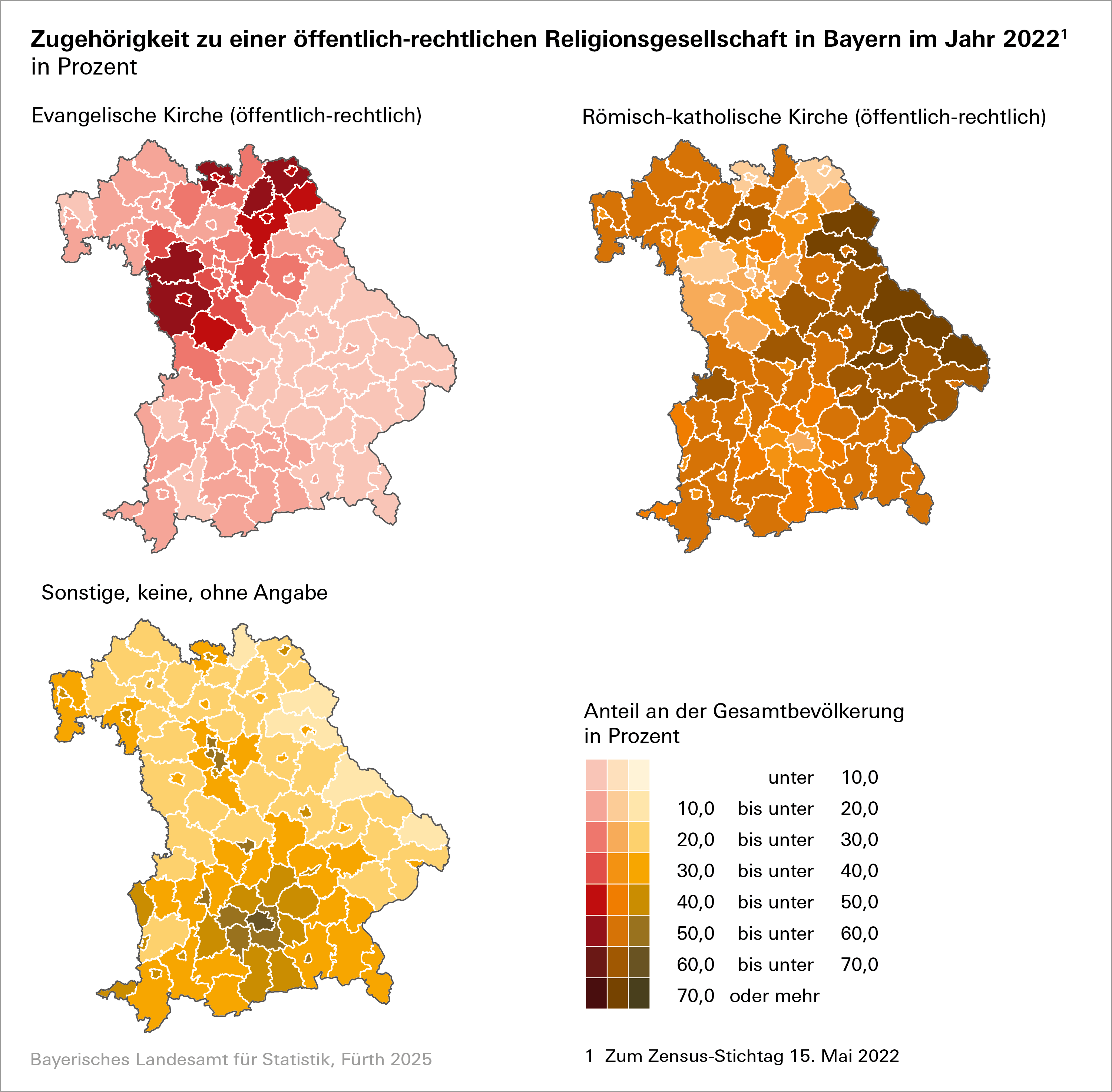 Einblicke in regionale und demographische Muster: Die aktuellen Zensusergebnisse geben Einblicke in die religiöse Vielfalt Bayerns und spiegeln im Vergleich mit dem Zensus 2011 die gesellschaftlichen Entwicklungen des vergangenen Jahrzehnts wider. Die Zensusergebnisse zeigen auf, wie sich die Mitgliederzahlen in Bayern in den beiden Großkirchen und in den kleineren öffentlich-rechtlichen Religionsgemeinschaften verändert haben. Sie belegen, dass die Kirchen trotz rückläufigen Mitgliederzahlen eine bedeutende und aktive Rolle in der bayerischen Gesellschaft halten – von zentralen Lebensereignissen bis in den Alltag.