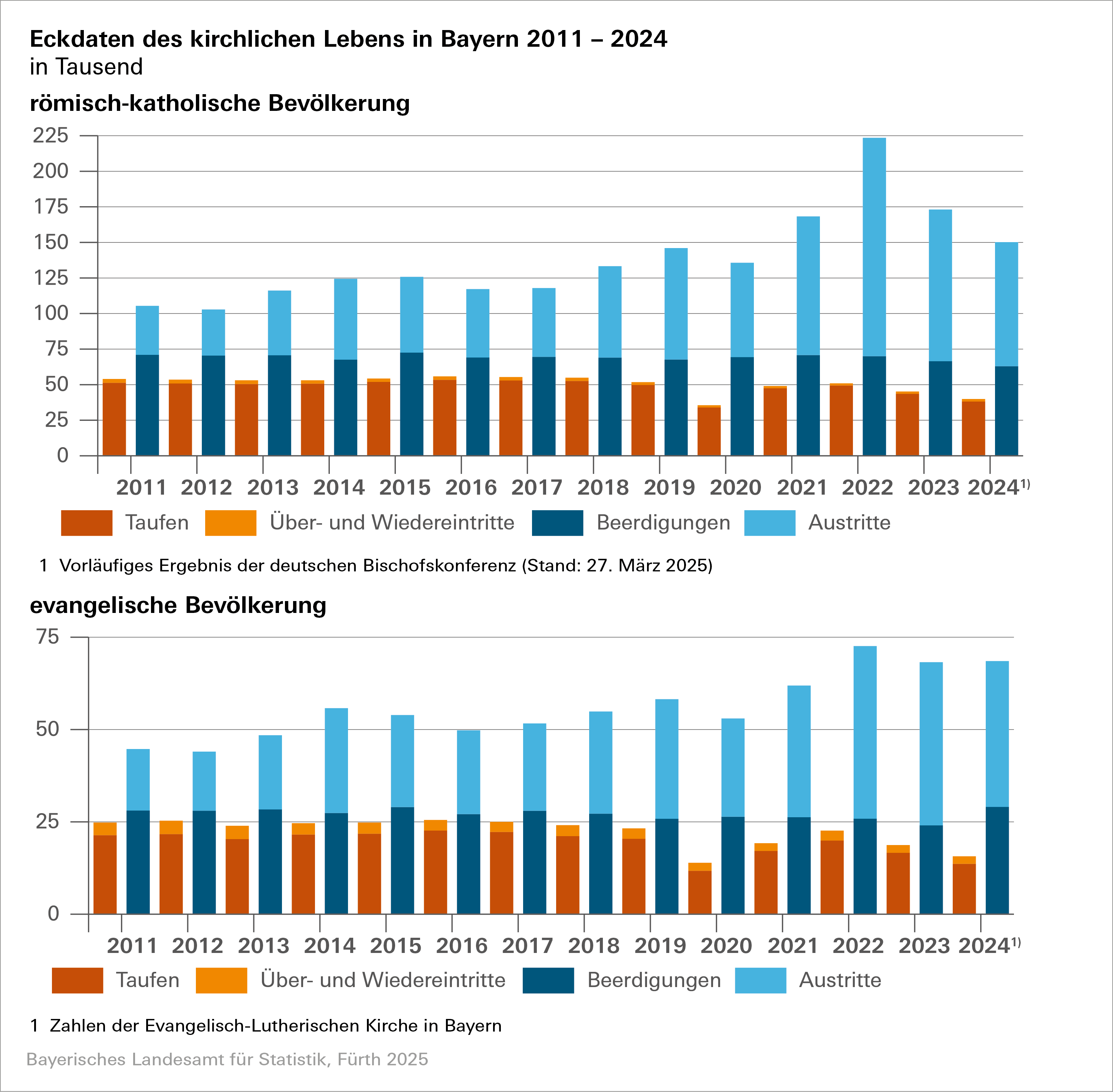 Bayern ist in den letzten Jahrzehnten durch Zuwanderung religiös und kulturell vielfältiger geworden. Gleichzeitig sinkt die Zahl der Mitglieder in der römisch-katholischen und evangelischen Kirche kontinuierlich. Das spiegelt sich in den Ergebnissen der letzten Zensus-Erhebungen wider: gehörten 2011 noch drei von vier Personen in Bayern einer der beiden großen Kirchen an, waren es 2022 noch etwas über 60 Prozent. Die detaillierte Analyse zeigt, dass die Zahl der Kirchenmitglieder trotz jährlichen Zuwächsen von durchschnittlich 73 000 Personen durch Taufen, Übertritte und Wiedereintritte insgesamt abnimmt. Bereits die Zahl der kirchlichen Beerdigungen und damit der Sterbefälle führt zu einem negativen Saldo, der durch zusätzliche Kirchenaustritte noch verstärkt wird.