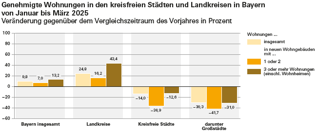 Regionale Unterschiede offenbaren sich am deutlichsten bei der Trennung der bayerischen Kreise nach Stadt und Land: In den Landkreisen erhöhen sich die Wohnungsbaugenehmigungen um 24,8 Prozent. Für die kreisfreien Städte ergibt sich insgesamt eine Verringerung des Genehmigungsvolumens um 14,0 Prozent, wobei in den Großstädten mit 30,3 Prozent der deutlichste Rückgang vorliegt.
