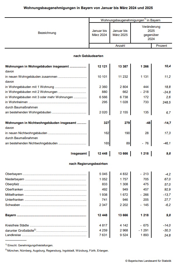 Von Januar bis März 2025 werden in Bayern insgesamt 13 666 Baugenehmigungen für Wohnungen erteilt. Nach Auskunft des Bayerischen Landesamts für Statistik steigt das Genehmigungsvolumen im Vergleich zum ersten Quartal 2024 um 9,8 Prozent beziehungsweise 1 218 Wohnungen.