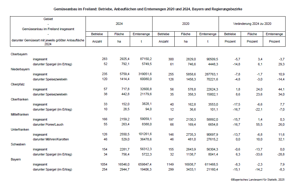 In Oberbayern wird auf 27,1 Prozent (792 ha) der Gemüseanbaufläche im Freiland der Spargel im Ertrag angebaut. Auch in Schwaben und Oberfranken dominiert das Edelgemüse die regionale Gemüseproduktion: Ein Drittel (33,2 Prozent, 756 ha) der Fläche in Schwaben wird hierfür genutzt, in Oberfranken sind es 18,8 Prozent (28,5 ha).