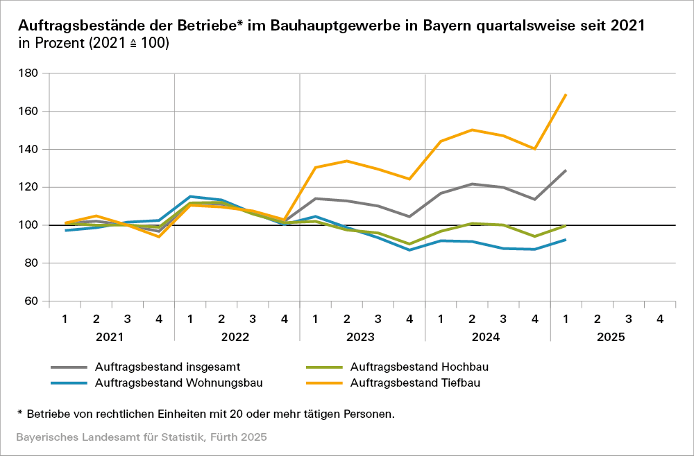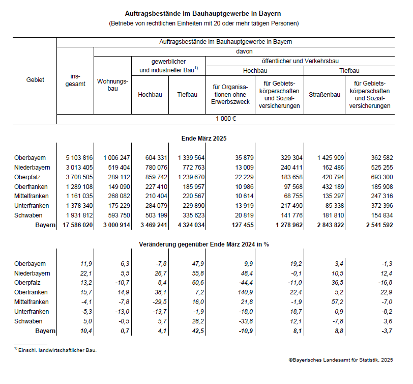 Ende März 2025 liegt der Auftragsbestand im bayerischen Bauhauptgewerbe bei einem Gesamtwert von 17,59 Milliarden Euro. Das entspricht einer Steigerung um 1,66 Milliarden Euro beziehungsweise 10,4 Prozent gegenüber dem Wert des Vorjahres. Nach weiteren Angaben der Fachgruppe im Bayerischen Landesamt für Statistik werden insbesondere für den gewerblichen und industriellen Tiefbau wertmäßig höhere Auftragsbestände als vor Jahresfrist festgestellt.