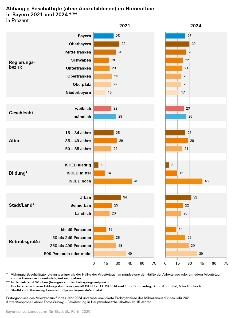 Auf Ebene der bayerischen Regierungsbezirke hat Oberbayern mit der Landeshauptstadt München mit 30 Prozent die höchste Homeoffice-Quote. In Niederbayern arbeiten die wenigsten Beschäftigten aus dem Homeoffice heraus. Die Quote liegt hier bei 17 Prozent. Die Regierungsbezirke Mittelfranken (26 Prozent), Schwaben (22 Prozent), Unterfranken (21 Prozent) sowie Oberfranken und die Oberpfalz liegen mit jeweils 20 Prozent Homeoffice-Quote dazwischen. Die Unterschiede dürften größtenteils auf strukturelle Faktoren zurückzuführen sein.