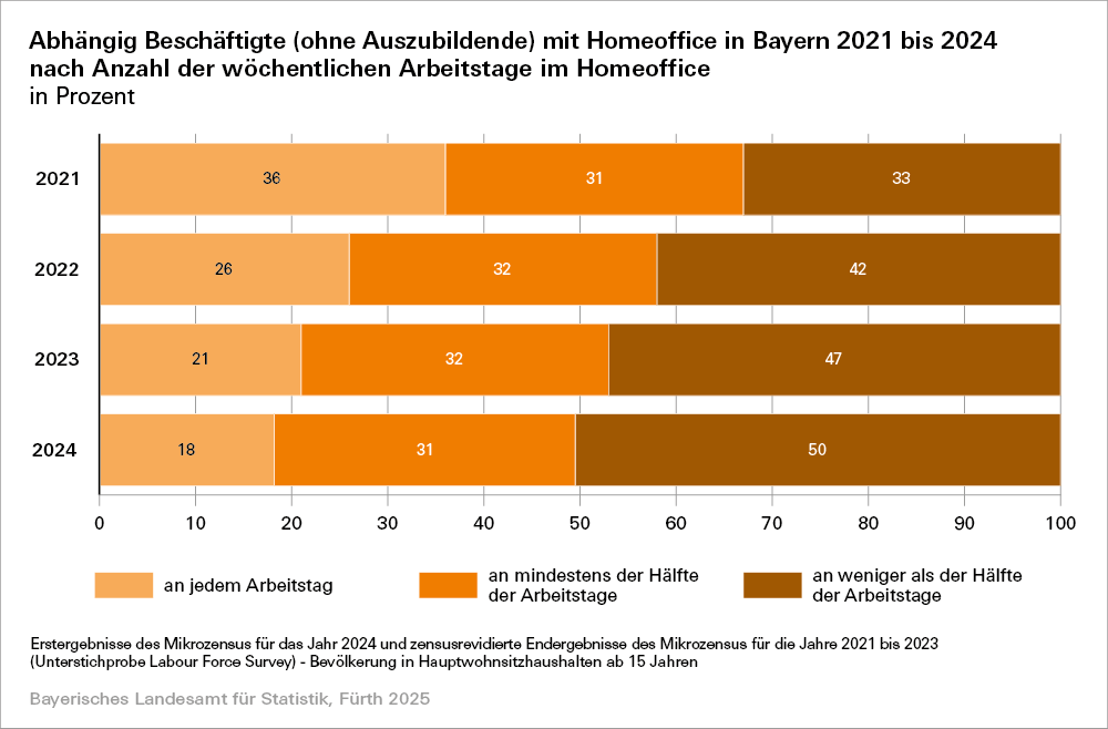 134 2025 42 A Mikrozensus LogoFürth. Nach den Erstergebnissen des Mikrozensus arbeitet im Jahr 2024 jeder vierte abhängig Beschäftigte in Bayern mindestens einen Tag in der Woche von zu Hause aus. Die Homeoffice-Quote* bleibt damit seit der Corona-Pandemie zwar unverändert, jedoch hat sich die Anzahl der Homeoffice-Tage pro Woche deutlich reduziert. Im Jahr 2021 arbeiteten 36 Prozent der Beschäftigten mit Homeoffice noch täglich von zu Hause. Im Jahr 2024 sind es 18 Prozent. Gleichzeitig ist der Anteil der Beschäftigten, die weniger als die Hälfte ihrer Arbeitstage im Homeoffice verbringen, von 33 Prozent im Jahr 2021 auf 50 Prozent im Jahr 2024 angestiegen. Die Zahlen zeigen, dass Homeoffice weiter attraktiv ist, wobei Mischmodelle mit Büro- und Homeoffice-Tagen mittlerweile am ehesten genutzt werden. Vergleicht man die die letzten vier Jahre von 2021 bis 2024, sieht man einen kontinuierlichen Rückgang zu weniger Tagen im Homeoffice pro Woche (2021: 33 Prozent; 2022: 42 Prozent; 2023: 47 Prozent; 2024: 50 Prozent).