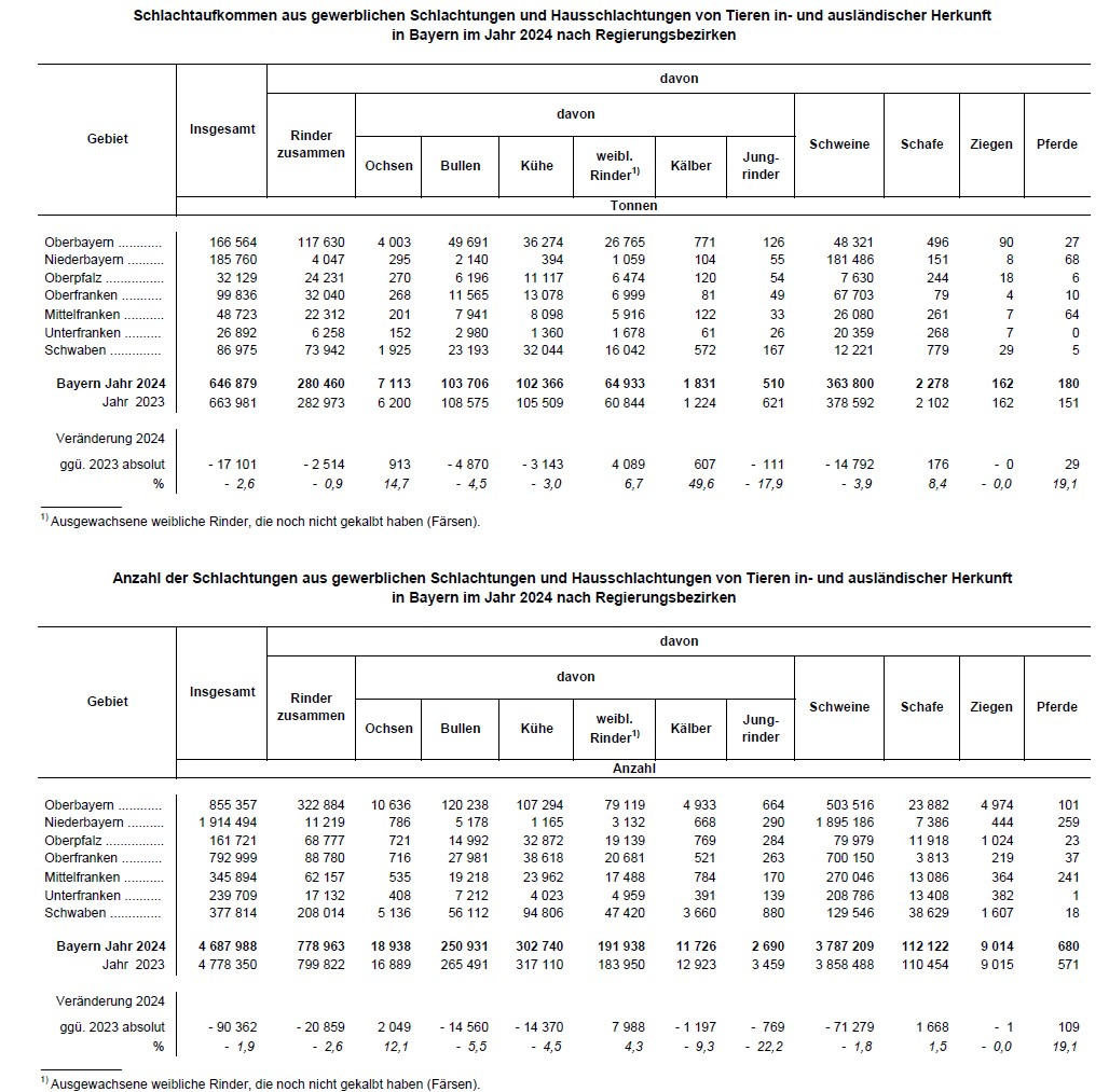 Fürth. Wie das Fachteam des Bayerischen Landesamtes für Statistik mitteilt, liegt die Erzeugung von zum Verzehr geeignetem Fleisch (ohne Geflügelfleisch) in Bayern im Jahr 2024 bei 646 900 Tonnen (t). Dieser Wert, der die Fleischerzeugung in gewerblichen Schlachtbetrieben und durch Hausschlachtungen umfasst, entspricht im Vergleich zum Vorjahr einem Rückgang um 2,6 Prozent bzw. 17 100 t.