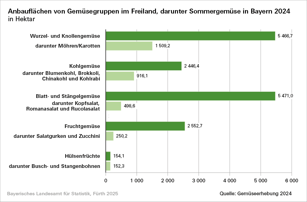 Fürth. Wie das Bayerische Landesamt für Statistik auf der Grundlage der Ergebnisse der allgemeinen Gemüseerhebung, die alle vier Jahre als Vollerhebung in Bayern durchgeführt wird, mitteilt, verzeichnen die Anbauflächen im Freiland und die Produktionsmengen von sommerlichem Gemüse im Jahr 2024 gegenüber dem Jahr 2020 in Bayern deutliche Zunahmen (siehe Tabelle 1 in der Infobox). Gemeint ist Gemüse im Freiland, das zu großen Teilen in den Sommermonaten Juni, Juli und August geerntet wird.