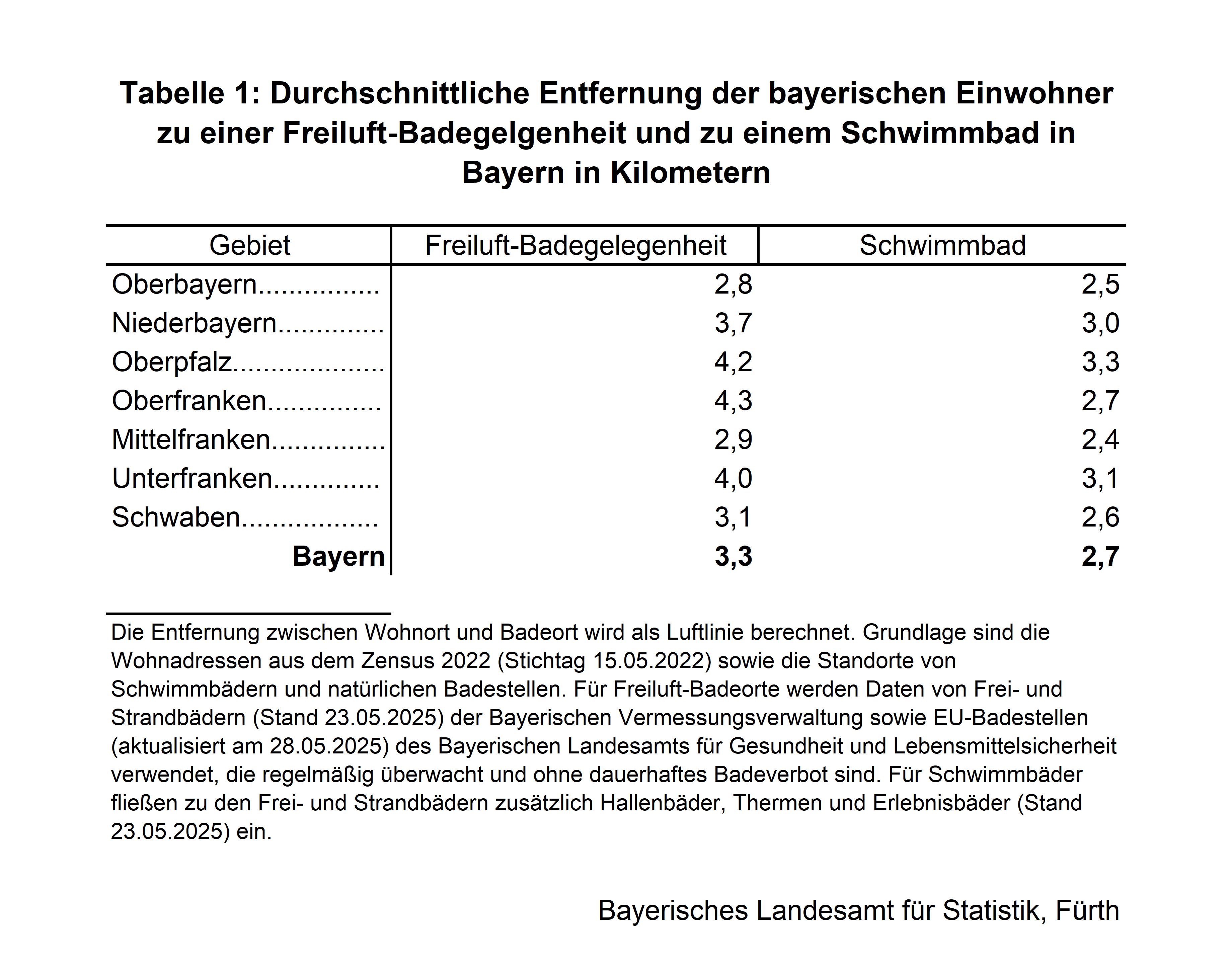 Die Entfernung zwischen Wohn- und Badeort wird als Luftlinie (kürzeste Strecke) berechnet.1) Die Daten zu den Wohnorten stammen aus dem Zensus 2022. Als Badeorte werden in Bayern Frei-, Strand-, Hallen- und Erlebnisbäder, Thermen sowie natürliche Badestellen berücksichtigt. Ein kurzer Beitrag zur Methodik ist in der Juli Ausgabe der Monatszeitschrift Bayern in Zahlen zu finden.