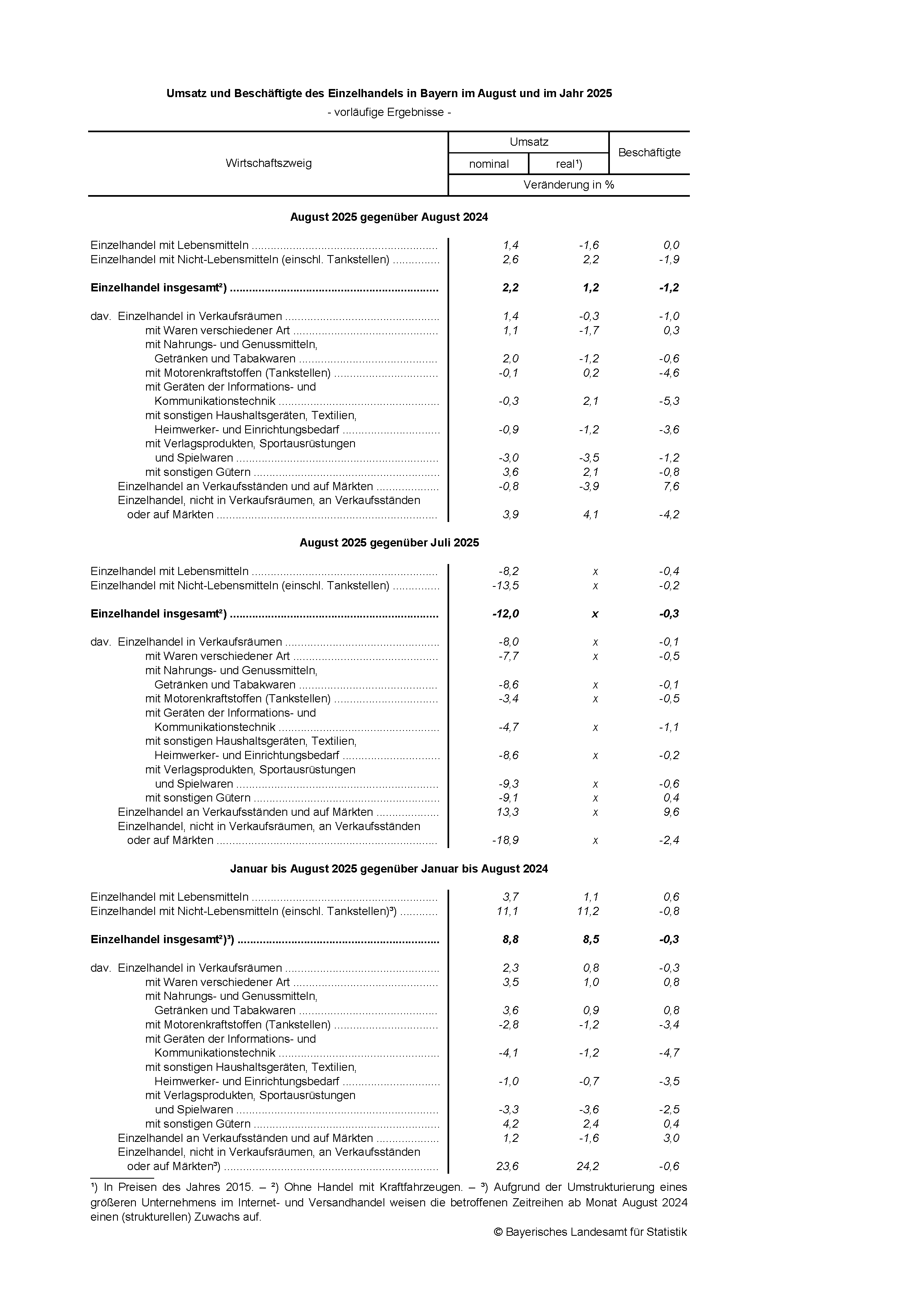 Im Vergleich zum Vormonat Juli 2025 geht der nominale Umsatz des Einzelhandels in Bayern im August 2025 um 12,0 Prozent zurück. Die Beschäftigtenzahl nimmt um 0,3 Prozent ab.