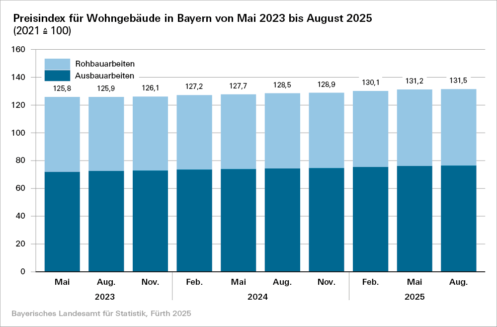 Im Jahresvergleich sind im August 2025 die Preise für den Neubau von Wohngebäuden in Bayern um durchschnittlich 2,3 Prozent gestiegen. Im Mai 2025 hatte die Preissteigerungsrate binnen Jahresfrist 2,7 Prozent betragen. Nach der sehr dynamischen Preisentwicklung, die seit Mitte 2022 mit Preissprüngen von über 17 Prozent zu beobachten war, stabilisierten sich die Preise seit 2024 auf vergleichsweise hohem Niveau.