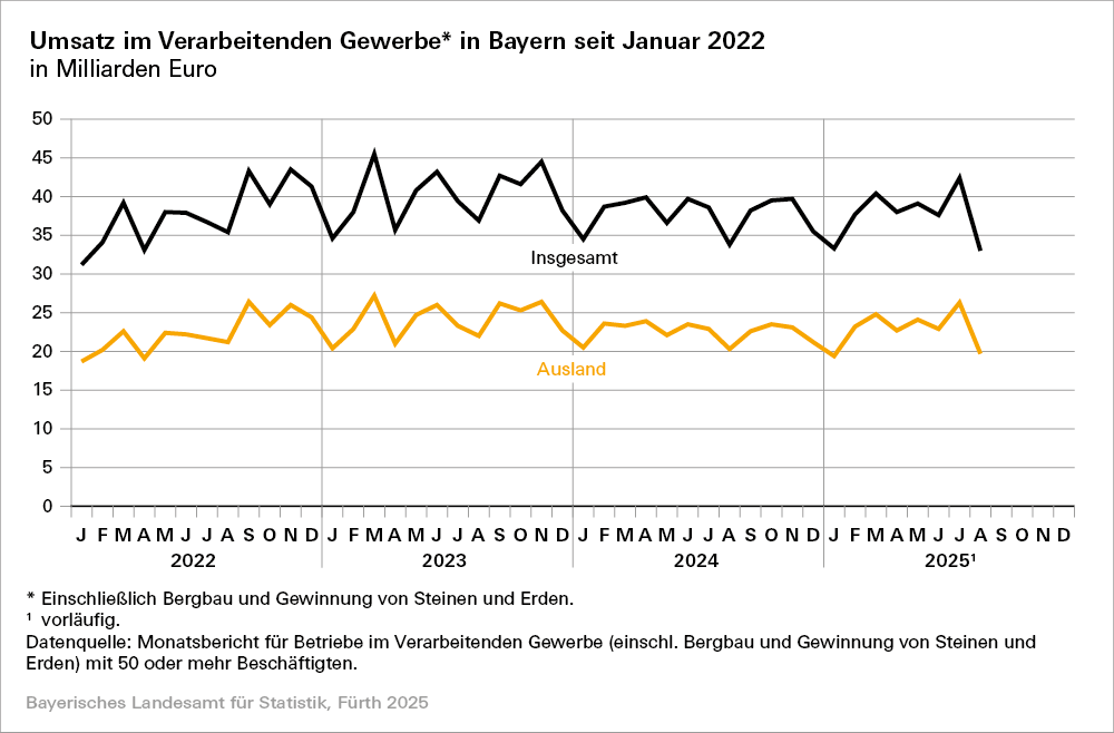 ihr Anteil am Gesamtumsatz beläuft sich auf 18,7 Prozent. Die Nachfrage nach bayerischen Industriegütern geht preisbereinigt um 0,4 Prozent zurück. Der Personalstand verringert sich Ende August 2025 um 2,2 Prozent gegenüber dem Vorjahresmonat.