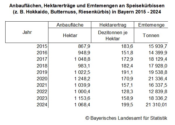 Die bayerische Kürbisernte liegt im Jahr 2024 bei rund 21 310 Tonnen. Im Vergleich zum Vorjahr mit rund 18 336 Tonnen steigt die Produktion um 16,2 Prozent. Hokkaido-, Butternut-, Riesen- und andere Speisekürbisse werden von 351 Betrieben auf einer Freilandfläche von rund 1 068 Hektar angebaut. Der erzielte Hektarertrag liegt im Jahr 2024 mit 199,5 Dezitonnen pro Hektar um 25,5 Prozent höher als im Jahr 2023 (158,9 Dezitonnen pro Hektar).