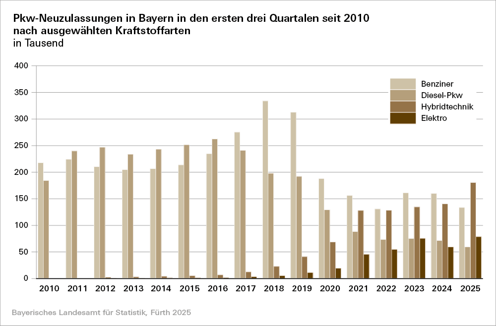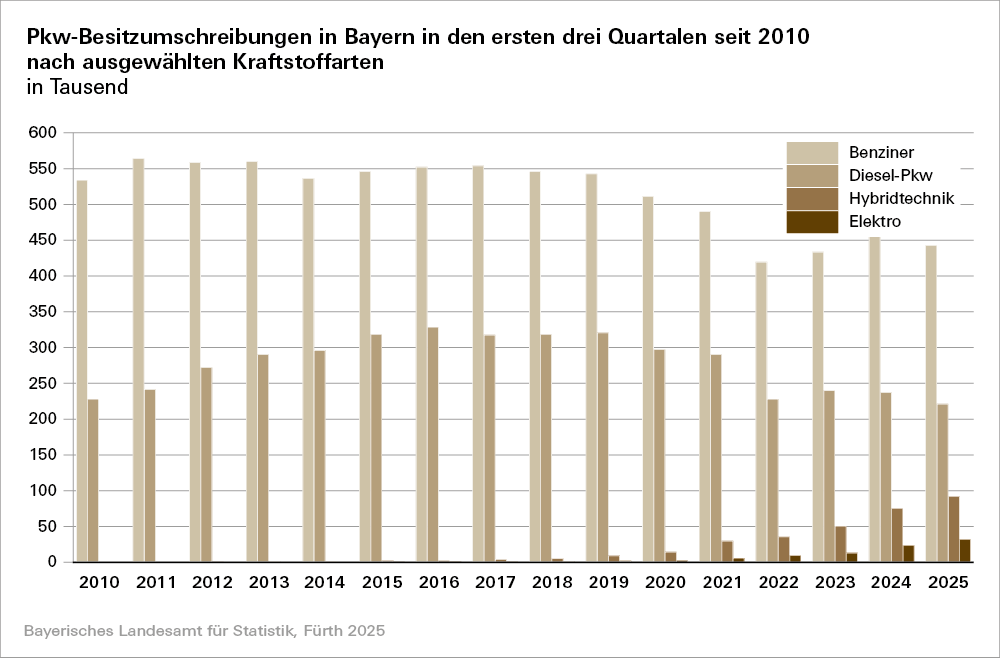 Wie das Verkehrsteam des Bayerischen Landesamts für Statistik weiter mitteilt, steigt die Anzahl der Pkw-Neuzulassungen insgesamt in den ersten drei Quartalen 2025 um 4,7 Prozent auf 453 701 Fahrzeuge. Dabei werden 16,6 Prozent weniger Pkw mit Benzinantrieb neu zugelassen (133 645) als im Vorjahreszeitraum. Die Zahl der neu zugelassenen Diesel-Pkw sinkt nahezu im gleichen Maße um 16,8 Prozent auf 59 556.  2025 werden bisher somit nur noch 42,6 Prozent der neu zugelassenen Pkw mit einem klassischen Verbrennungsmotor mit Benzin oder Diesel angetrieben.