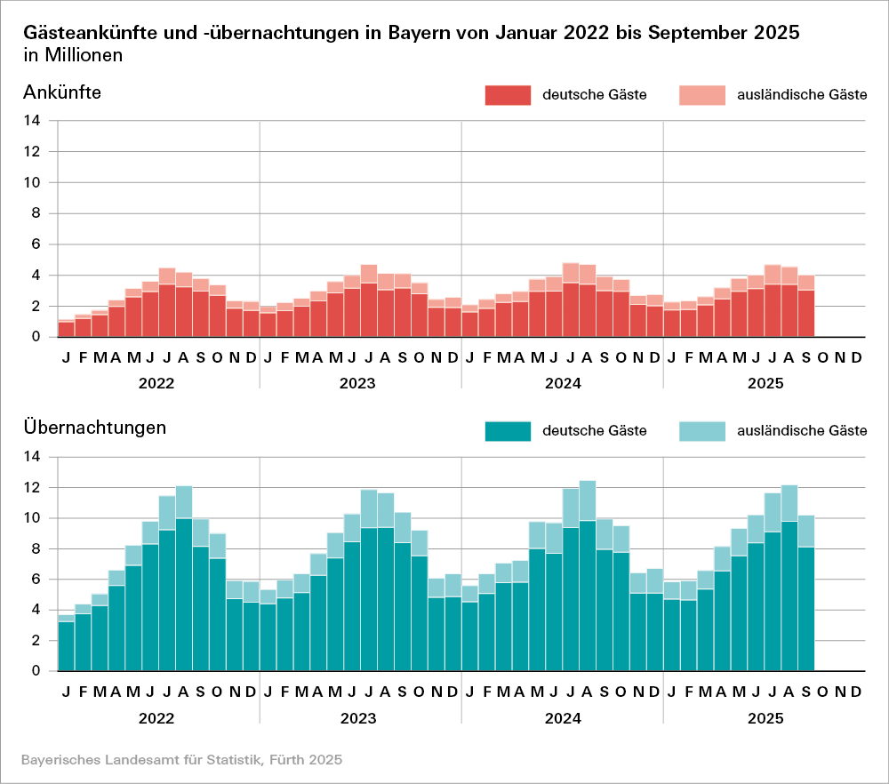 Nach Angabe des Bayerischen Landesamtes für Statistik registrieren die 11 431 im September 2025 geöffneten Beherbergungsbetriebe1) Bayerns rund 4,0 Millionen Gästeankünfte und rund 10,2 Millionen Übernachtungen. Damit liegt die Zahl der Gästeankünfte 2,4 Prozent und die Zahl der Übernachtungen 2,7 Prozent über dem Niveau des Vorjahresmonats. Dabei zeigen die Übernachtungszahlen internationaler Gäste ein stärkeres Wachstum (+4,9 Prozent) als die Übernachtungen von Gästen aus Deutschland (+2,2 Prozent).