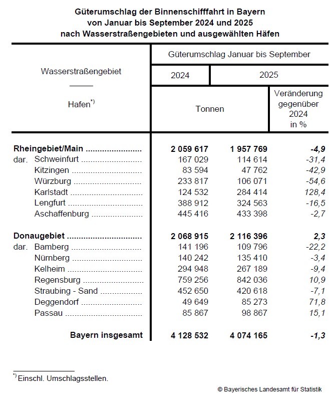 Schweinfurt. In den ersten drei Quartalen 2025 melden sich in den bayerischen Häfen insgesamt 4 735 Schiffe mit Umschlagsgütern an und ab. Davon befahren mit 58,7 Prozent mehr als die Hälfte der Schiffe (2 780) die Donau. Insgesamt knapp 4,1 Millionen Tonnen Güter werden von Januar bis September 2025 in den bayerischen Häfen der Bundeswasserstraßen von Passau über Nürnberg bis Aschaffenburg umgeschlagen. Dies entspricht einem Rückgang um 1,3 Prozent im Vergleich zum Vorjahreszeitraum. Nach Angaben des Bayerischen Landesamts für Statistik werden in den bayerischen Häfen knapp 1,9 Millionen Tonnen eingeladen und rund 2,2 Millionen Tonnen Güter ausgeladen.