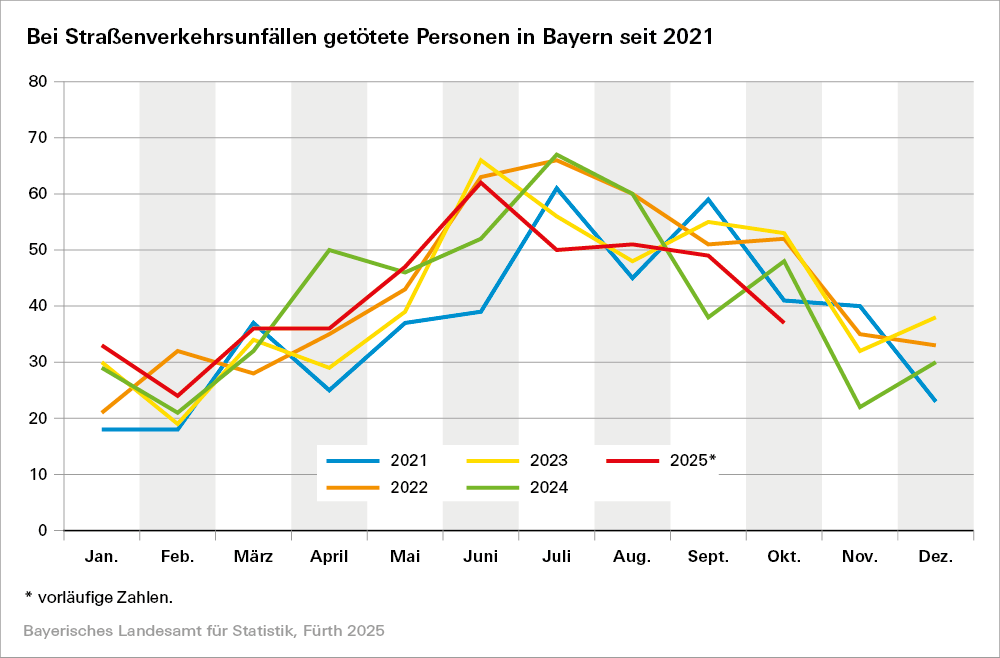 Ausführliche Ergebnisse enthält der Statistische Bericht, der (voraussichtlich) im Dezember 2025 erscheint: „Straßenverkehrsunfälle in Bayern im Oktober 2025“ (Bestellnummer: H1101C 202510).