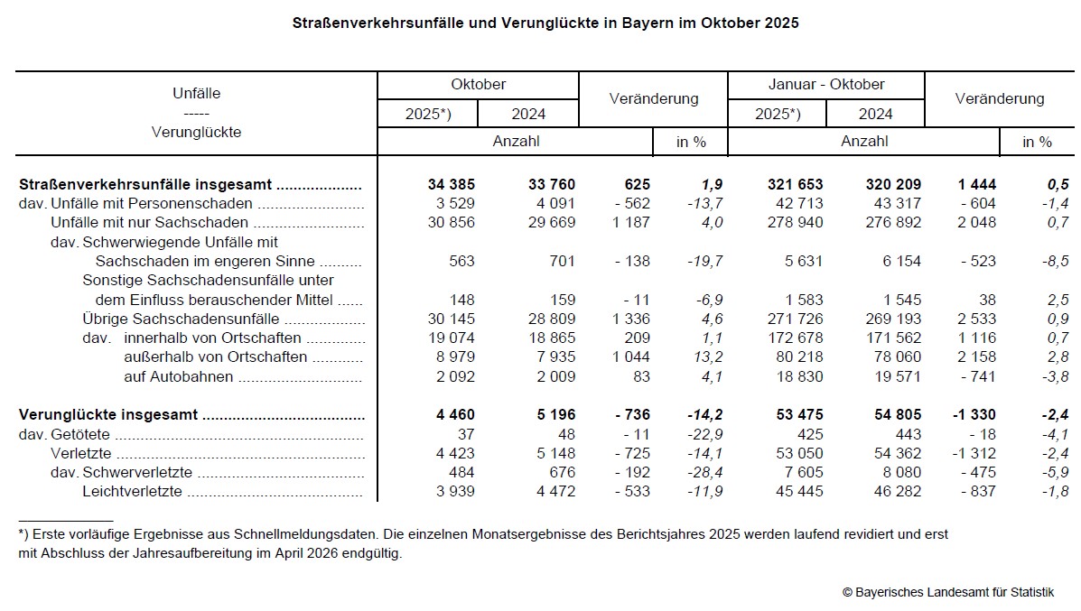 Nach vorläufiger Meldung der Polizei wurden im Oktober 2025 insgesamt 34 385 Straßenverkehrsunfälle in Bayern registriert. Das entspricht einem leichten Anstieg um 1,9 Prozent gegenüber dem Vorjahresmonat. Laut Mitteilung des Bayerischen Landesamts für Statistik verunglückten dabei insgesamt 4 460 Personen (-14,2 Prozent). Davon wurden 4 423 Verkehrsteilnehmer verletzt (-14,1 Prozent), 37 Personen wurden bei einem Verkehrsunfall getötet (Oktober 2024: 48).