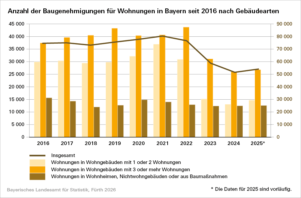Statistische Bericht „Baugenehmigungen in Bayern 2025“ (Bestellnummer: F2102C 202500). Detaillierte Ergebnisse für den Berichtsmonat Dezember 2025 beinhaltet der voraussichtlich in KW 06/2026 erscheinende
