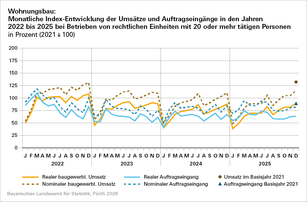 Im Vergleich zum Bezugsmonat des Basisjahres 2021 liegen die Auftragseingänge insgesamt im Dezember 2025 nominal um 7,5 Prozentpunkte höher, preisbereinigt jedoch um 17,6 Prozentpunkte niedriger (siehe Grafik 1). Auch beim Umsatz zeigt sich dieser Gegensatz: Während gegenüber 2021 nominal ein Anstieg von 11,4 Prozentpunkten erreicht wird, ergibt sich real ein Rückgang um 22,1 Prozentpunkte. Der (preisbereinigte) Werte des Bezugsmonats Dezember im Basisjahre 2021 wird in den Graphiken 1 und 2 jeweils als brauner Punkt (Umsatz) und blaues Dreieck (Auftragseingang) über den aktuellen Monatswerten dargestellt.