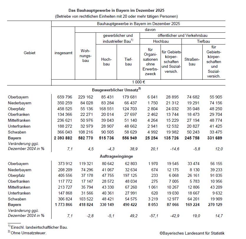 Die Auftragseingänge im bayerischen Bauhauptgewerbe steigen im Dezember 2025 ebenfalls um 7,1 Prozent. Deutlich positiv entwickeln sich die Auftragsvergaben im Vorjahresvergleich in allen Bausparten des Tiefbaus: +49,2 Prozent im gewerblichen und industriellen Tiefbau, +19,0 Prozent im Straßenbau und +14,7 Prozent in öffentlichen Tiefbau für Gebietskörperschaften und Sozialversicherungen.