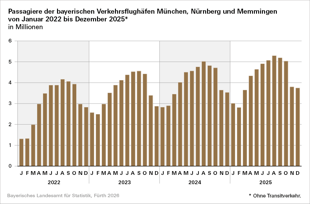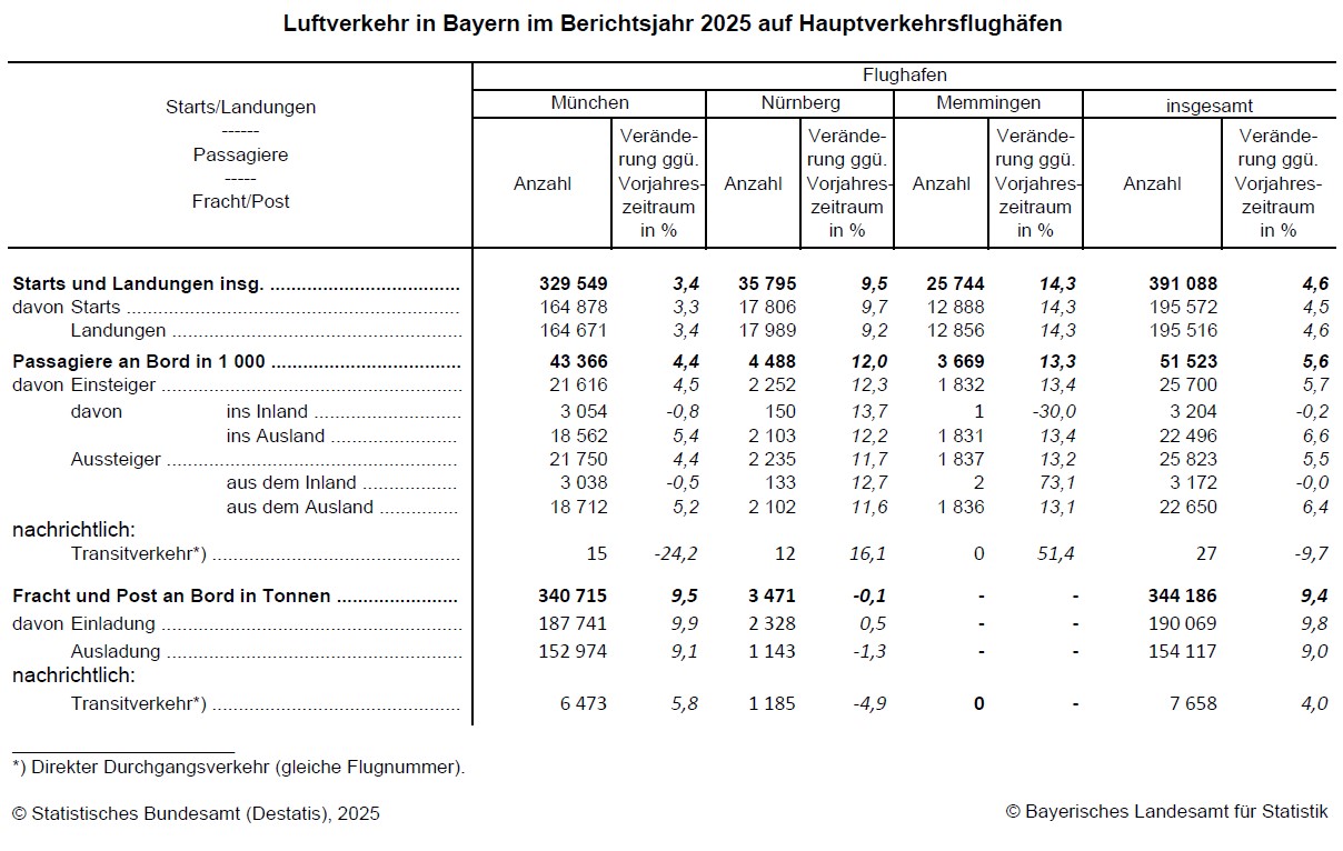 Wie das Bayerische Landesamt für Statistik mitteilt, verzeichnen die drei bayerischen Verkehrsflughäfen1) München, Nürnberg und Memmingen im Berichtsjahr 2025 eine erneute Zunahme der Flugbewegungen und des Passagieraufkommens. Nach aktuellen Daten des Statistischen Bundesamts werden 391 088 Starts und Landungen registriert, was einem Anstieg um 4,6 Prozent gegenüber dem Vorjahr entspricht. Die Anzahl der beförderten Passagiere wächst um 5,6 Prozent auf rund 51,5 Millionen. Insgesamt werden 344 186 Tonnen Luftfracht transportiert, 9,4 Prozent mehr als im Vorjahr.