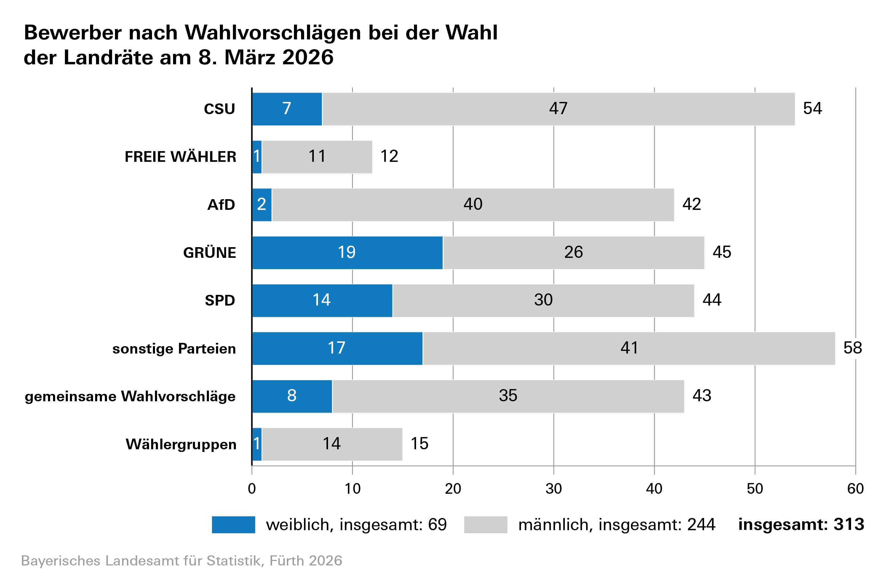 In 62 der 71 Landkreise Bayerns wird eine Landrätin bzw. ein Landrat gewählt. Um diese Posten bewerben sich insgesamt 313 Personen, darunter 69 Frauen (22,0 Prozent). Die meisten Bewerberinnen und Bewerber – insgesamt zehn – werden im Landkreis Weilheim-Schongau (Oberbayern) auf dem Stimmzettel stehen. Demgegenüber können die Wahlberechtigten in den Landkreisen Garmisch-Partenkirchen (Oberbayern), Freyung-Grafenau (Niederbayern) sowie Kitzingen (Unterfranken) jeweils nur zwischen einer Bewerberin und einem Bewerber ihre Wahl treffen.