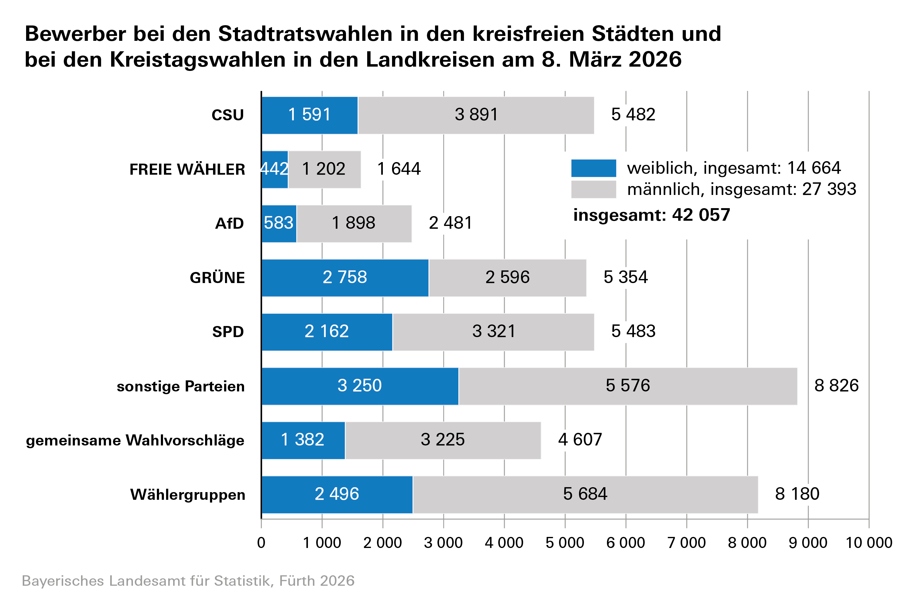 Zusammengenommen stellen sich somit auf Ebene der 96 Landkreise und kreisfreien Städte insgesamt 42 057 Bewerber zur Wahl. Das entspricht einem leichten Anstieg in Höhe von rund 2,0 Prozent gegenüber den Kommunalwahlen 2020. Die Zahl der Frauen unter den Bewerbern (insgesamt 14 664) stieg gegenüber 2020 geringfügig um rund 3,5 Prozent an, was einem Zuwachs des Frauenanteils um rund 0,5 Prozentpunkte (alt: 1,5 Prozentpunkte) entspricht.