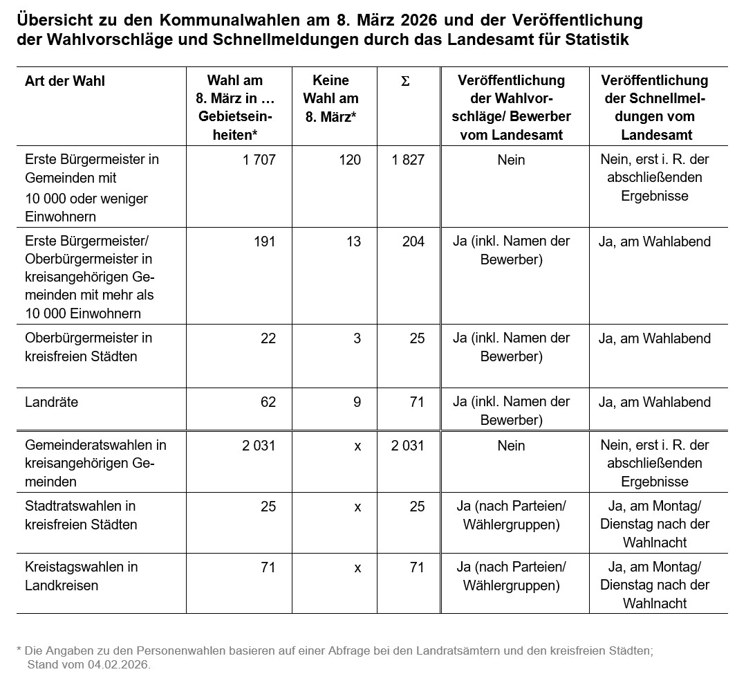 Ab Montag, 9. März 2026, werden zudem die Schnellmeldungsergebnisse für die Stadtratswahlen in den 25 kreisfreien Städten und die Kreistagswahlen in den 71 Landkreisen eintreffen und nachfolgend abrufbar sein.