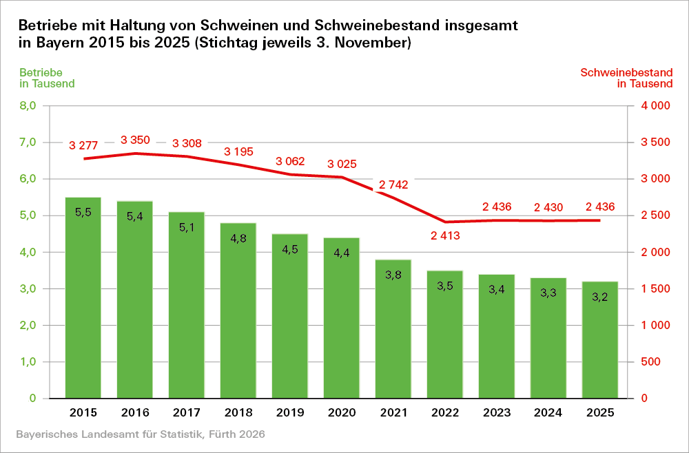 Schweinebestand in Bayern steigt im Jahr 2025 um 0,2 Prozent – im Vergleich zu 2015 Rückgang um mehr als 25 Prozent