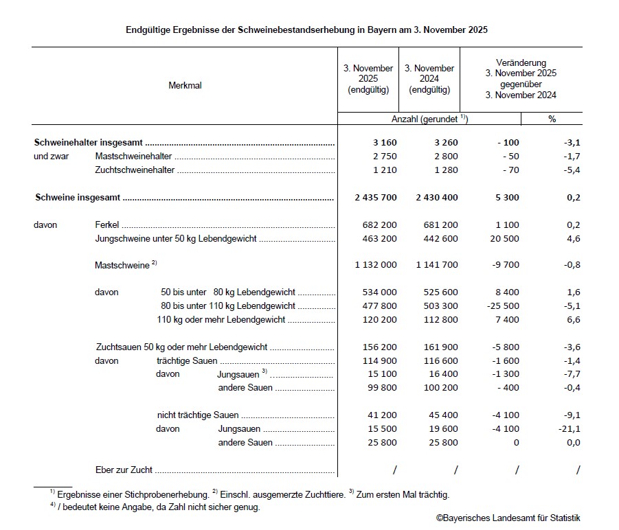 Fürth. Wie das Bayerische Landesamt für Statistik nach den endgültigen Ergebnissen der Schweinebestandserhebung zum Stichtag 3. November 2025 mitteilt, ist die Zahl der Schweine gegenüber dem Vorjahr um 0,2 Prozent (5 300 Tiere) auf 2 435 700 Tiere gestiegen. Die Anzahl der schweinehaltenden Betriebe liegt bei rund 3 160, das sind 3,1 Prozent weniger als ein Jahr zuvor: Zum 3. November 2024 waren noch rund 3 260 Betriebe in Bayern aktiv. Im Durchschnitt hält jeder Betrieb 771 Tiere, etwa 26 mehr als im November 2024.
