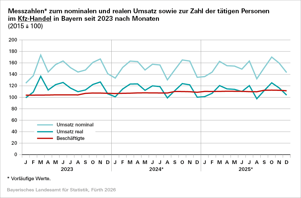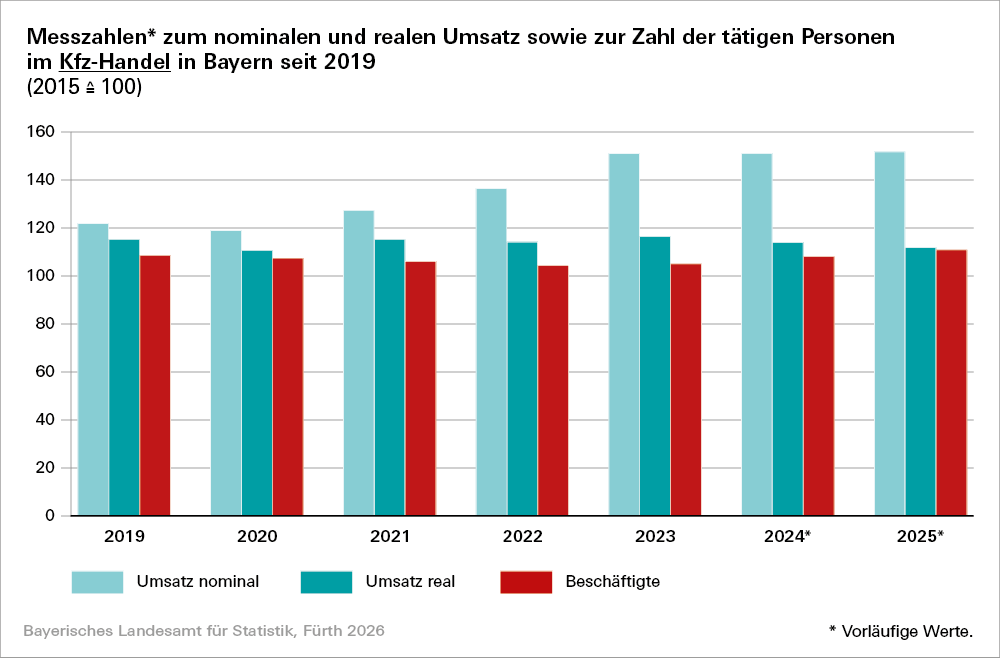 Nominaler Umsatz der bayerischen Kfz-Händler nimmt 2025 um 0,4 Prozent zu, realer Umsatz sinkt um 2,0 Prozent