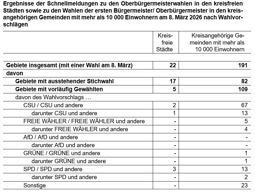 Dem Landesamt lagen zusätzlich die Schnellmeldungsergebnisse zu insgesamt 191 Oberbürgermeister- bzw. Bürgermeisterwahlen in kreisangehörigen Gemeinden mit mehr als 10 000 Einwohnern vor. In insgesamt 109 Gemeinden errang eine Bewerberin oder ein Bewerber mehr als die Hälfte der Stimmen. Die CSU konnte 67, die Partei FREIE WÄHLER fünf, DIE GRÜNEN eine, sowie die SPD 13 Wahlen gewinnen. Die vorgenannten Zahlen beinhalten dabei auch gemeinsame Wahlvorschläge, bei denen die jeweilige Partei in der Bezeichnung des Wahlvorschlags jeweils an erster Stelle genannt wird. 23 der vorläufig gewählten Bürgermeister entfallen auf übrige gemeinsame Wahlvorschläge/ Wählergruppen. In 82 kreisangehörigen Gemeinden wird es eine Stichwahl am 22. März 2026 geben.