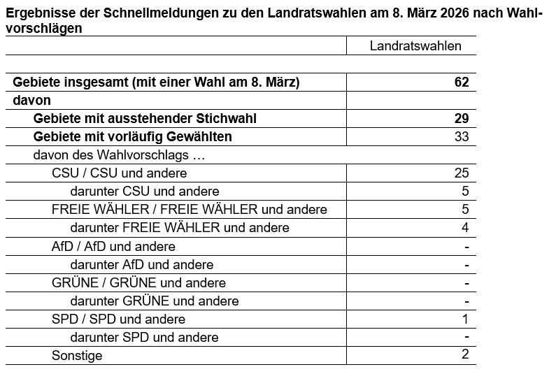 Am 8. März 2026 war in 22 kreisfreien Städten Bayerns der Oberbürgermeister und in 62 Landkreisen der Landrat zu wählen. Wie das Bayerische Landesamt für Statistik auf Basis der Schnellmeldungen mitteilt, konnte dabei in fünf kreisfreien Städten und 33 Landkreisen jeweils ein Bewerber oder eine Bewerberin die notwendige absolute Mehrheit der Stimmen erreichen. In 46 kreisfreien Städten und Landkreisen ist hingegen am 22. März jeweils eine Stichwahl notwendig. Die Wahlbeteiligung betrug bei der Wahl der Oberbürgermeister in den kreisfreien Städten 53,6 Prozent und bei der Wahl der Landräte in den Landkreisen