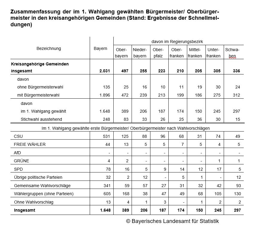 Neben den bereits veröffentlichten Schnellmeldungsergebnissen der Landratswahlen, Oberbürgermeisterwahlen und Bürgermeisterwahlen in Gemeinden mit mehr als 10 000 Einwohnern liegen nun auch die Schnellmeldungen zu allen durchgeführten 1 896 Bürgermeister- und Oberbürgermeisterwahlen in den 2 031 kreisangehörigen Gemeinden Bayerns vor. In 1 648 kreisangehörigen Gemeinden steht dabei der erste Bürgermeister/ Oberbürgermeister bereits im 1. Wahlgang fest (vorbehaltlich der Feststellung der abschließenden Ergebnisse). Die Verteilung auf die einzelnen Wahlvorschläge kann der nachfolgenden Tabelle entnommen werden. Stichwahlen sind hingegen in 248 kreisangehörigen Gemeinden erforderlich.