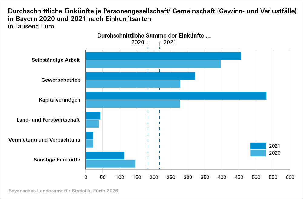 Nach Angaben des Bayerischen Landesamts für Statistik nahmen die bayerischen Finanzämter im Jahr 2021 für 244 557 Personengesellschaften und Gemeinschaften eine gesonderte und einheitliche Feststellung der Einkünfte vor. Diese Feststellung ist der Besteuerung der Gesellschafter bzw. Beteiligten vorgelagert. Insgesamt wurden hierbei Einkünfte in Höhe von zusammen 53,62 Milliarden Euro ermittelt, das waren 22,4 Prozent mehr als im Vorjahr. Das ist der stärkste Anstieg seit 2012.