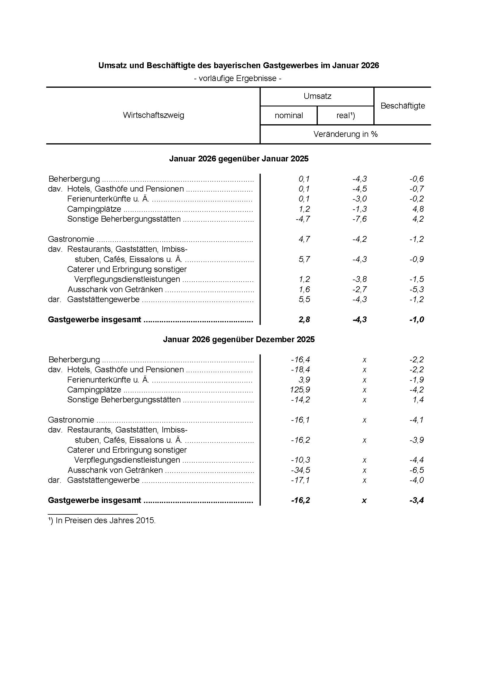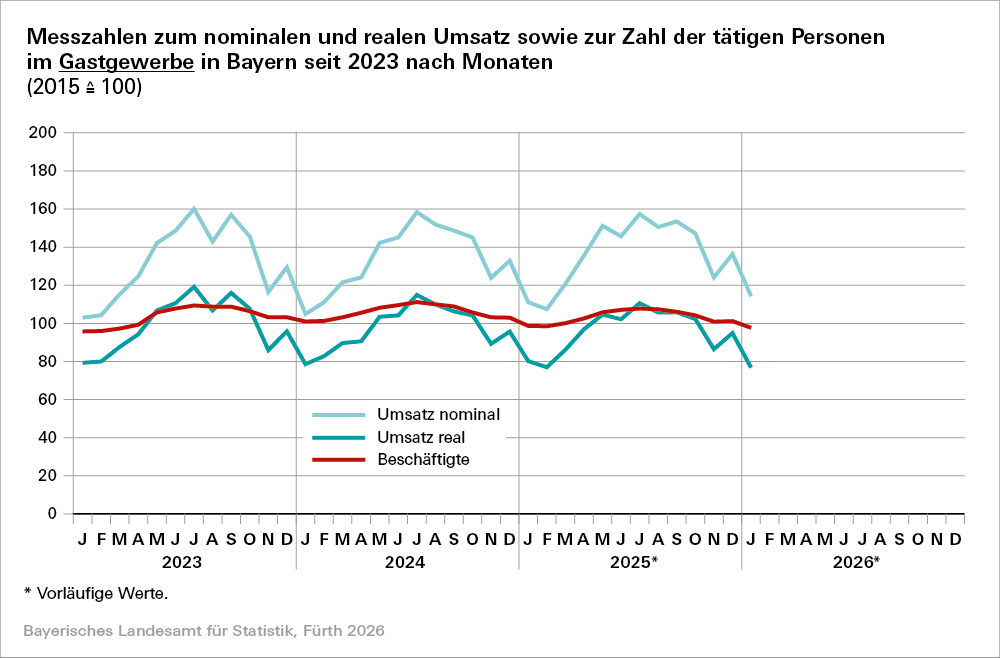 Nach einer Mitteilung des Bayerischen Landesamts für Statistik nach vorläufigen Ergebnissen der „Monatsstatistik im Gastgewerbe“ nimmt zwar der nominale Umsatz im bayerischen Gastgewerbe im Januar 2026 um 2,8 Prozent zu, nach Preisbereinigung liegt der (reale) Umsatz aber um 4,3 Prozent unter dem Umsatz des Januars 2025. Die Zahl der Beschäftigten sinkt um 1,0 Prozent.