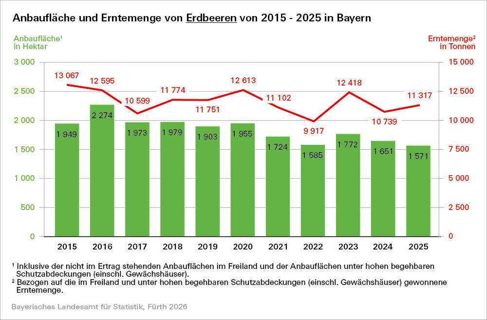 Bayernweit werden im Jahr 2025 durchschnittlich 69,3 dt Erdbeeren pro Hektar im Freiland geerntet. Im Vergleich zum Vorjahr mit 71,2 dt liegt ein Rückgang von 2,8 Prozent vor. Gegenüber dem langjährigen Mittel der Jahre 2019 bis 2024 (74,4 dt) ist beim Hektarertrag im Freiland ein Minus von 6,9 Prozent zu verzeichnen. Die Gesamterntemenge bei Erdbeeren (inkl. hoher begehbarer Schutzabdeckungen) liegt im Jahr 2025 bei 11 317 t, was einem Plus von 5,4 Prozent gegenüber dem Jahr 2024 (10 739 t) entspricht. Der Anteil der Erntemenge unter hohen begehbaren Schutzabdeckungen an der Gesamternte der Erdbeeren liegt 2025 bei 34,2 Prozent (3 868 t), der entsprechende Anteil der Anbaufläche bei 9,5 Prozent (149 ha).