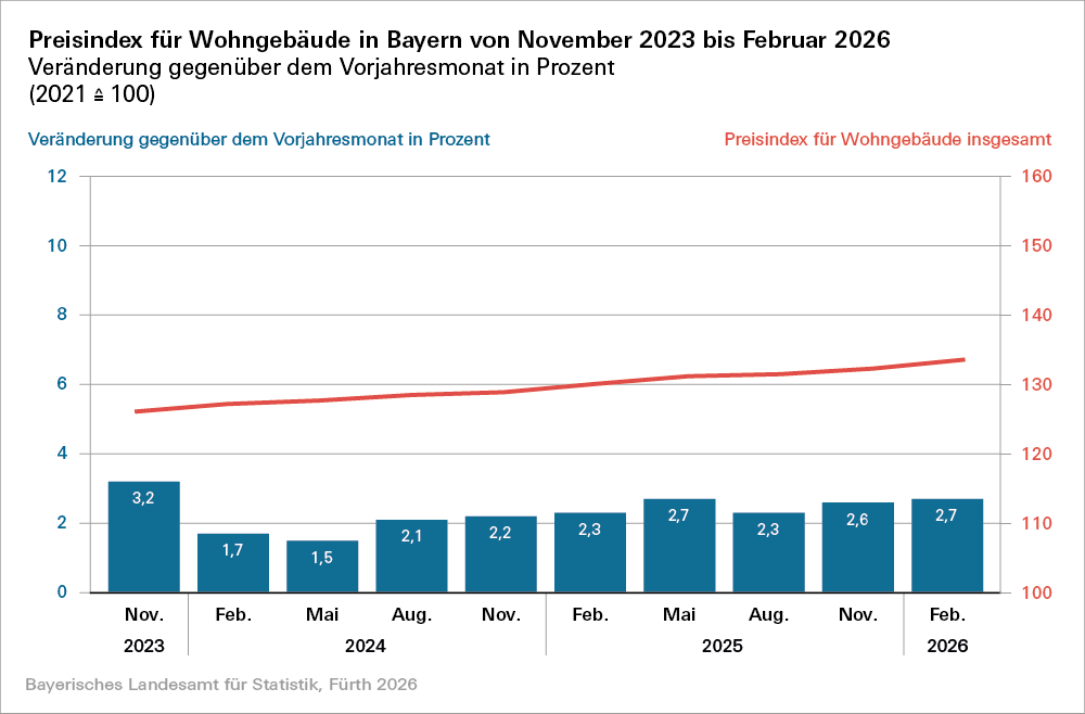 Im Jahresvergleich sind im Februar 2026 die Preise für den Neubau von Wohngebäuden in Bayern um durchschnittlich 2,7 Prozent gestiegen. Im November 2025 lag die Preissteigerungsrate binnen Jahresfrist auf einem ähnlichen Niveau (+2,6 Prozent). Seit 2021 sind die Preise für den Neubau für Wohnungen in Bayern damit um 33,6 Prozent gestiegen.