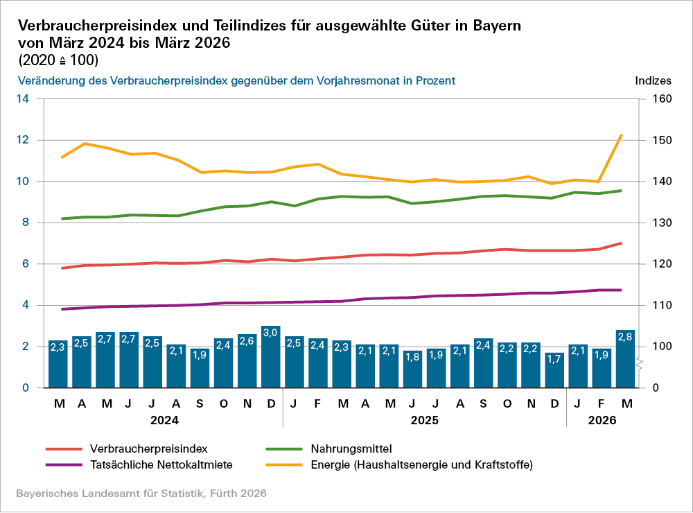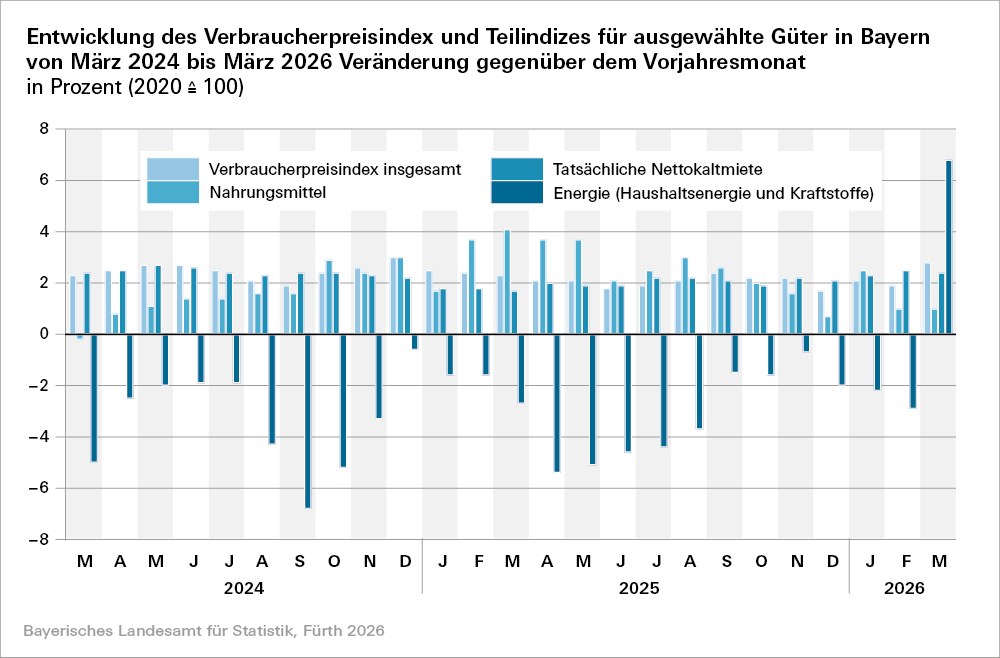 Fürth. Im Freistaat steigen die Verbraucherpreise im März 2026 gegenüber dem Vorjahresmonat um 2,8 Prozent. Dabei kosten Nahrungsmittel 1,0 Prozent mehr. Die Preise für Energie (Haushaltsenergie und Kraftstoffe) steigen im Vergleich zum Vorjahresmonat um 6,8 Prozent.