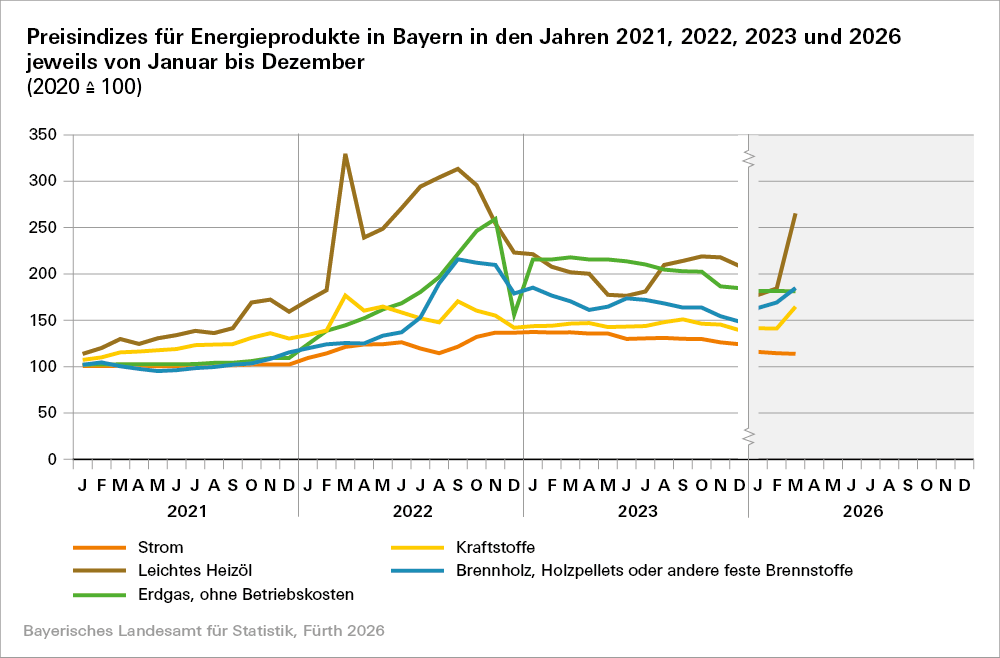 Im Vorjahresvergleich liegen die Preise für Energie im März 2026 um 6,8 Prozent über den Preisen von März 2025. Der Preis für Heizöl steigt spürbar um 44,8 Prozent gegenüber März 2025. Auch der Preis für Kraftstoffe ist im März 2026 gegenüber dem Vorjahresmonat stark gestiegen