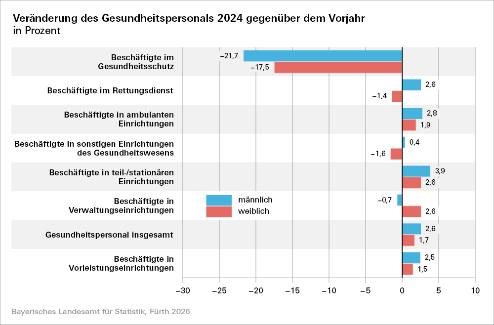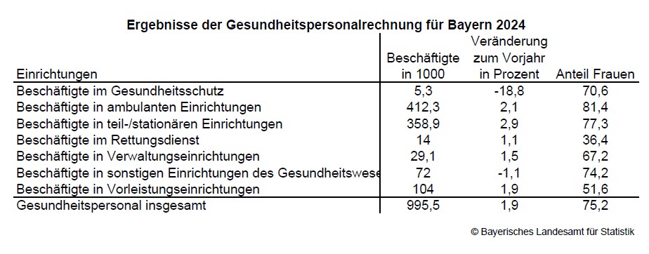 1,9 Prozent auf knapp 996 000. Der Anstieg fällt bei Männern mit 2,6 Prozent stärker aus als bei Frauen mit 1,7 Prozent. Zuwächse sind insbesondere bei den Beschäftigten in ambulanten und (teil-)stationären Einrichtungen zu verzeichnen, während es im Gesundheitsschutz zu Rückgängen kommt, die auf einen außergewöhnlich starken Personalanstieg während der COVID-19-Pandemie mit anschließend beschleunigtem Abbau zurückzuführen sind. Laut der Verdiensterhebung steigen die durchschnittlichen Bruttojahresverdienste der Vollzeitbeschäftigten im Gesundheitswesen in Bayern im Jahr 2024 mit 8,3 Prozent überdurchschnittlich stark – bei Frauen deutlicher als bei Männern