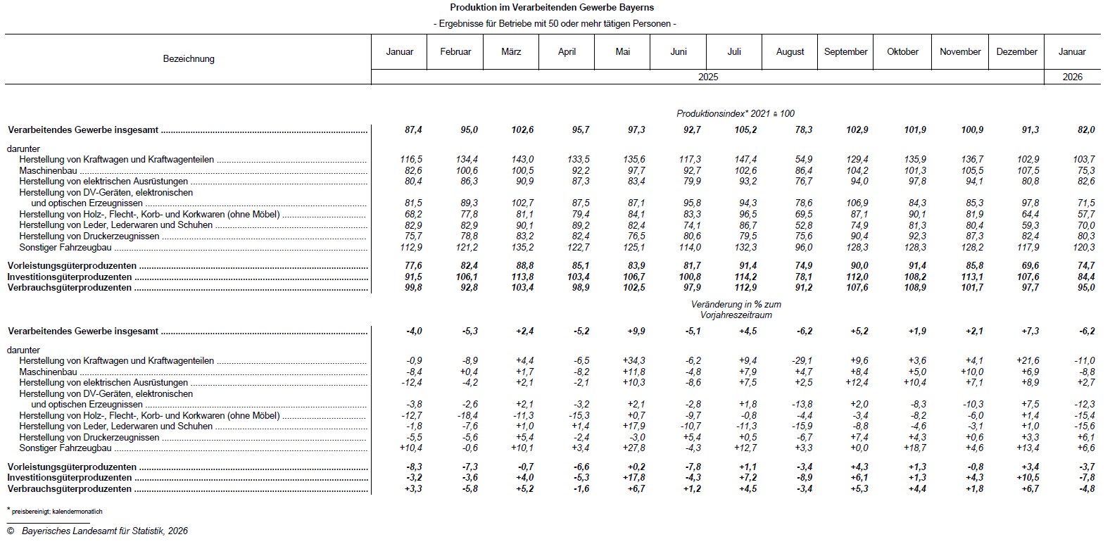 Bei Betrachtung der einzelnen Branchen des Verarbeitenden Gewerbes bleiben im Januar 2026 vor allem die „Herstellung von Leder, Lederwaren und Schuhen“ (-15,6 Prozent), die „Herstellung von Holz-, Flecht-, Korb- und Korkwaren (ohne Möbel)“ (‑15,4 Prozent) und die „Herstellung von DV-Geräten, elektronischen und optischen Erzeugnissen“ (-12,3 Prozent) hinter dem Ergebnis des Vorjahresmonats zurück. Auch in Bayerns gewichtigen Wirtschaftszweigen „Herstellung von Kraftwagen und Kraftwagenteilen“ (-11,0 Prozent) und „Maschinenbau“ (-8,8 Prozent) werden deutliche Produktionsdrosselungen verzeichnet. Dagegen verbuchen insbesondere der „Sonstige Fahrzeugbau“ (+6,6 Prozent) und die „Herstellung von Druckerzeugnissen“ (+6,1 Prozent) spürbare Produktionssteigerungen.