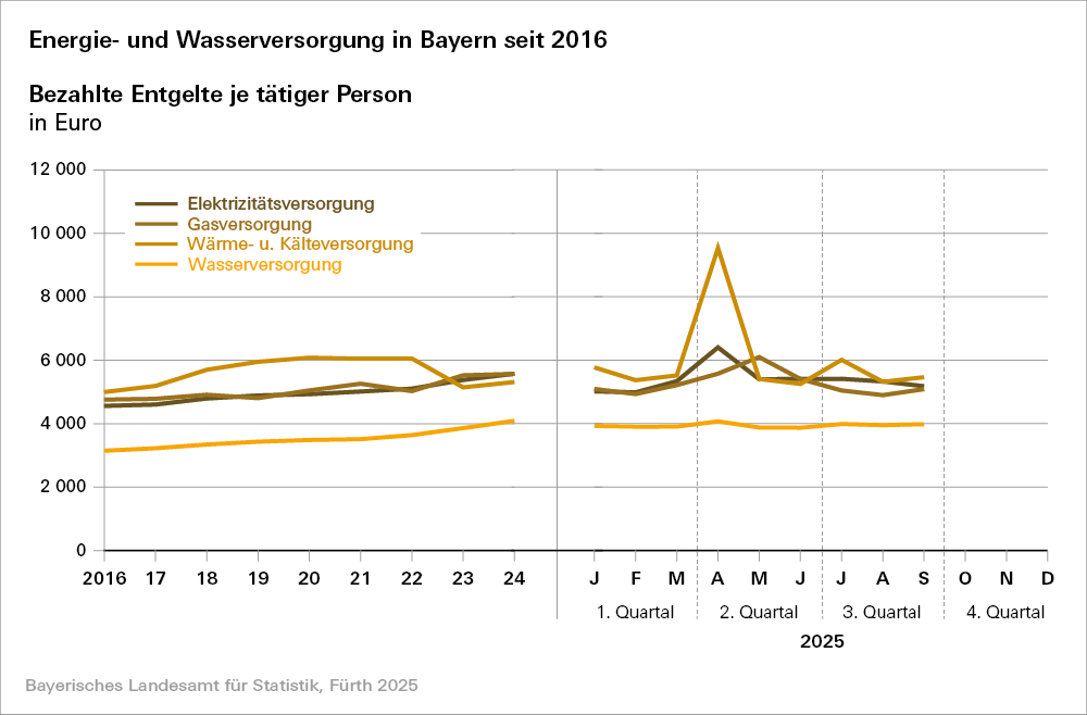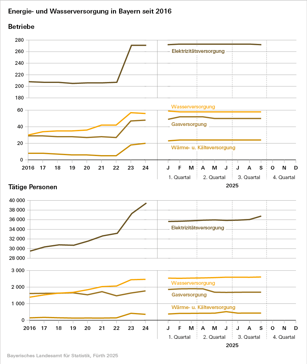 Die Konjunktur- und Strukturerhebungen liefern bei Betrieben von Unternehmen der Energie- und Wasserversorgung mit 20 oder mehr Beschäftigten Daten zu den dort tätigen Personen, deren geleisteten Arbeitsstunden und der dort bezahlten Entgelte.