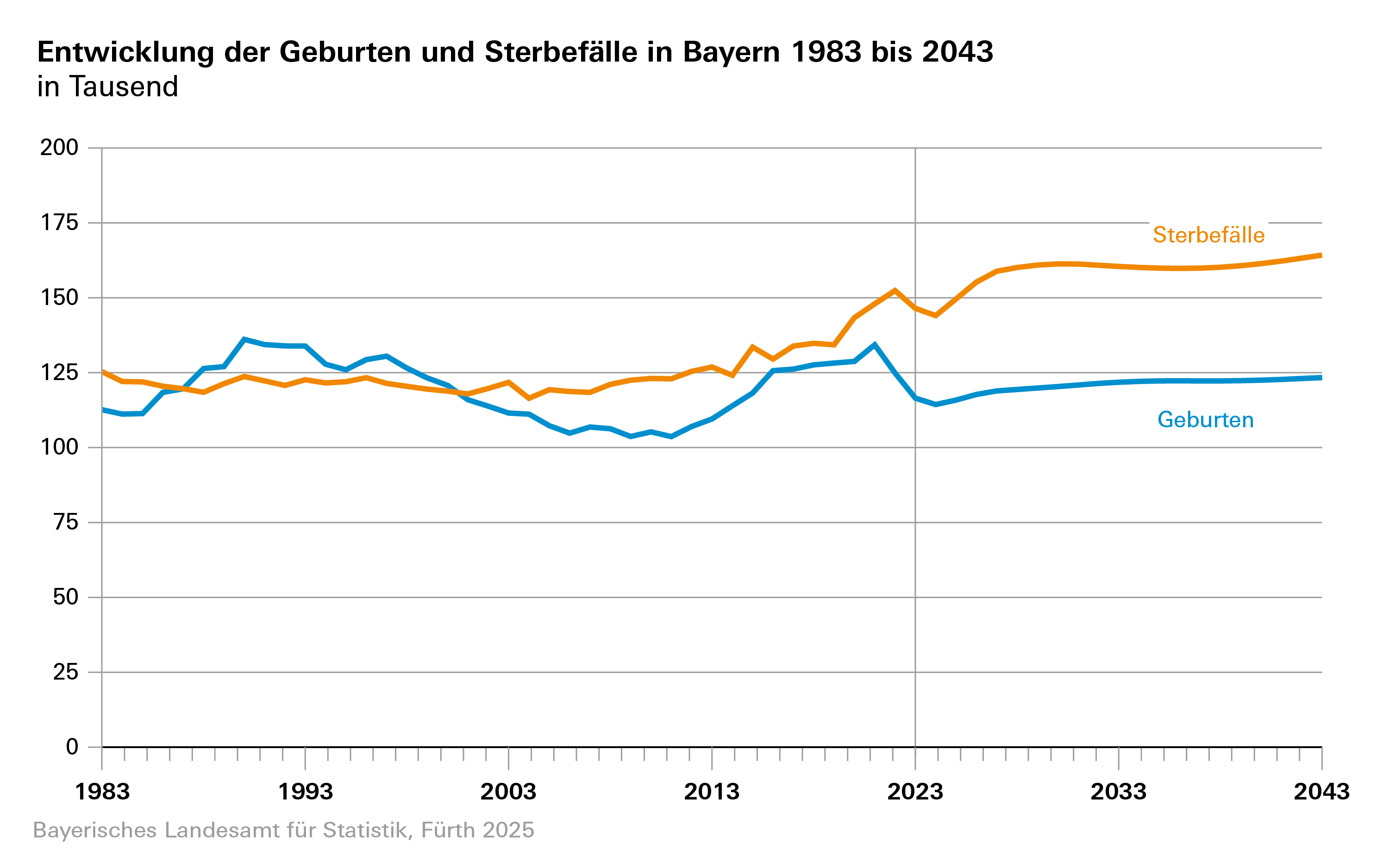 Die Regionalisierte Bevölkerungsvorausberechnung bis 2043 veranschaulicht mögliche Folgen des demographischen Wandels für Bayern. Die Zahl der Geburten wird demnach fast überall im Freistaat unterhalb der weiter ansteigenden Zahl der Sterbefälle bleiben. Aufgrund der natürlichen Bevölkerungsbewegung würde die Einwohnerzahl also künftig zurückgehen. Dennoch erwartet Bayern insgesamt durch die anhaltenden Wanderungsgewinne bis zum Jahr 2043 ein Bevölkerungswachstum.