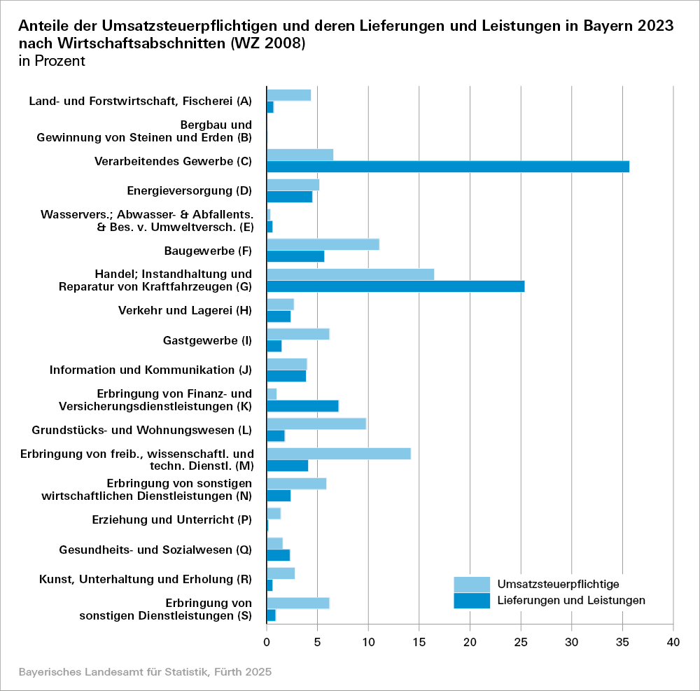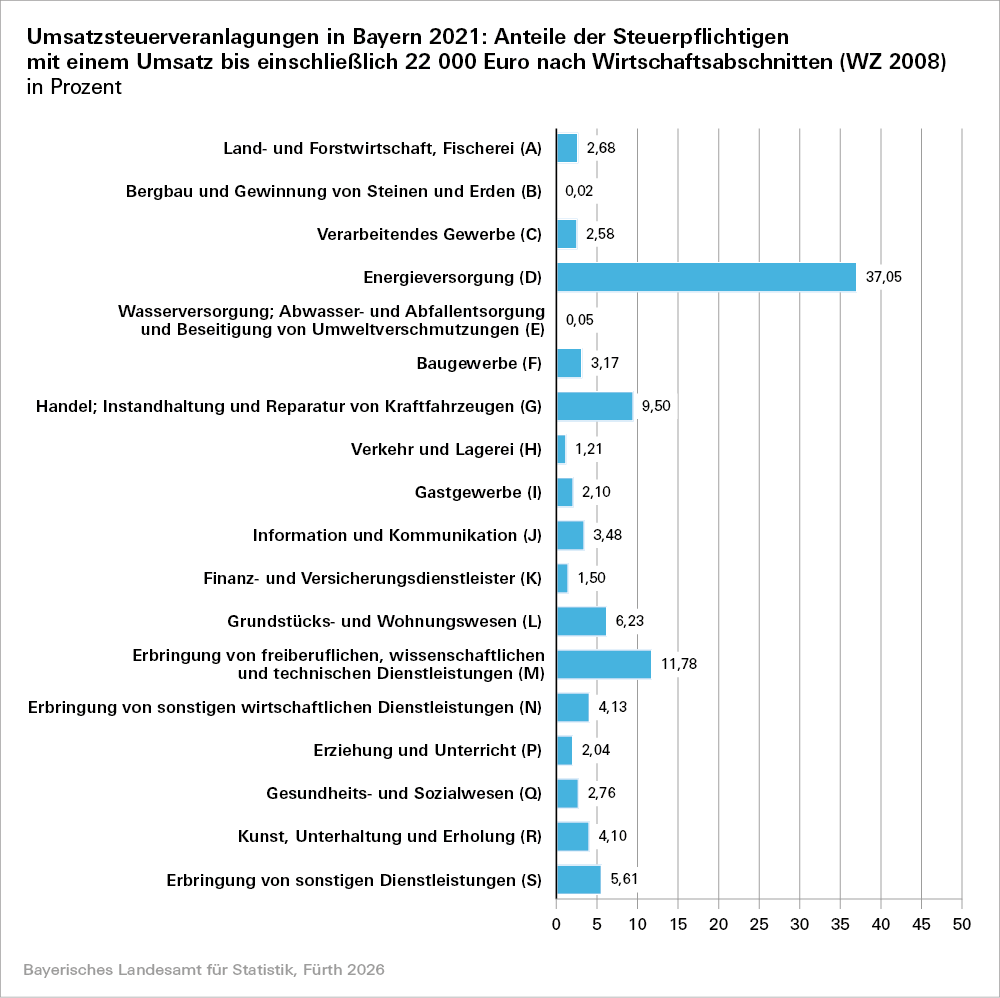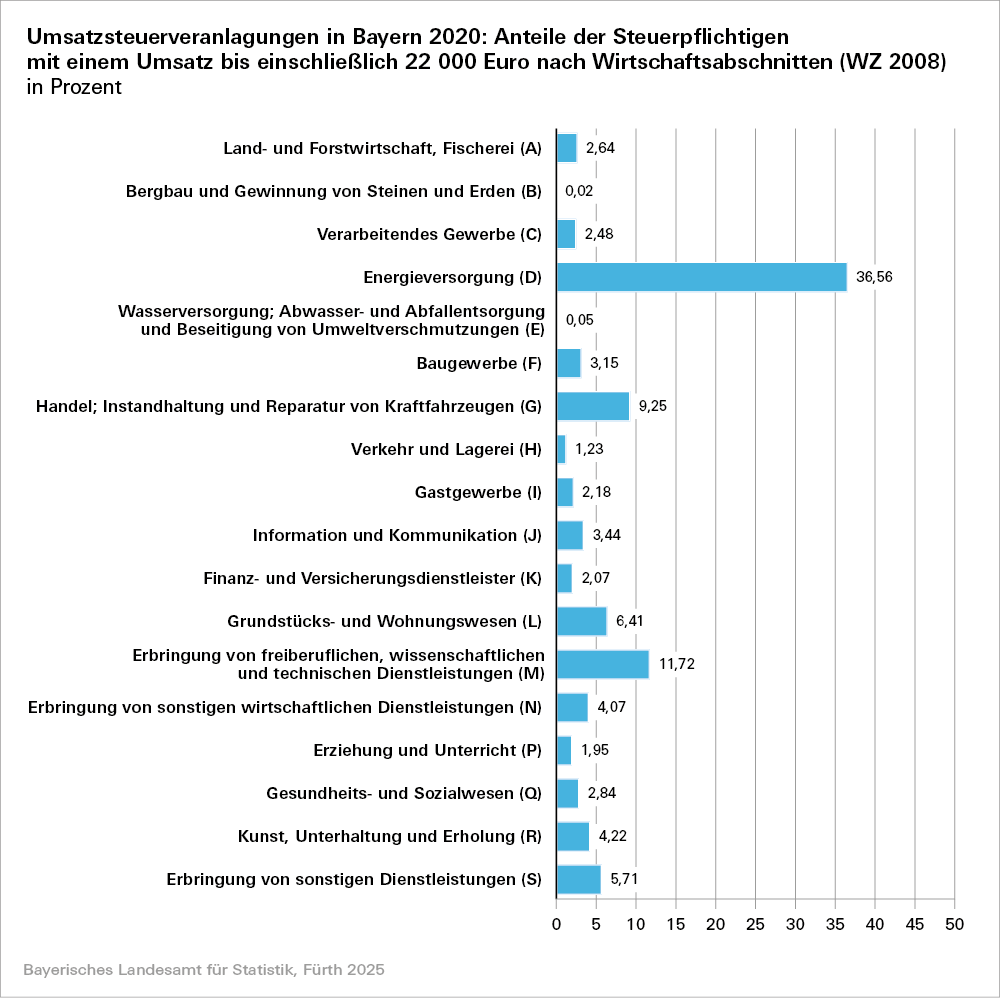 Die Umsatzsteuerstatistik weist alle Unternehmen nach, die monatlich oder vierteljährlich Umsatzsteuer-Voranmeldungen in Bayern abgaben und deren Umsatz aus Lieferungen und Leistungen (ohne Umsatzsteuer) über 22 000 Euro (bis einschließlich 2019: 17 500 Euro) betrug. Die wirtschaftliche und regionale Zuordnung der Umsätze erfolgt nach dem Unternehmenskonzept.